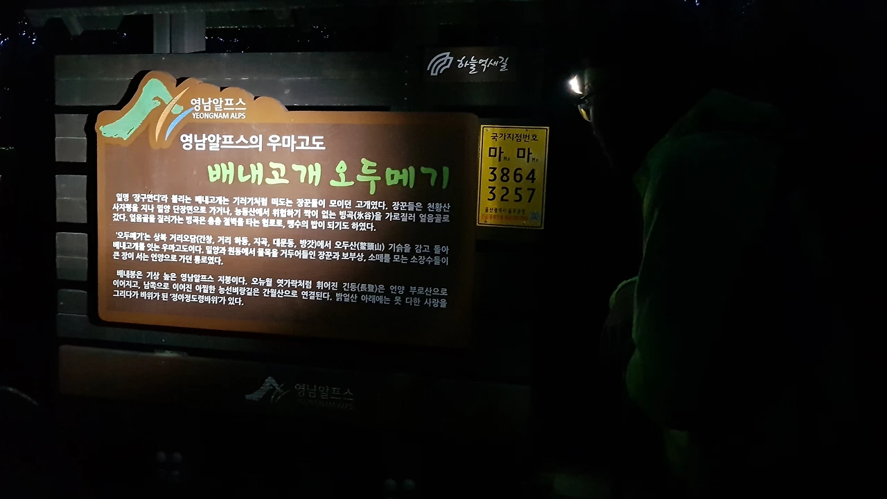 택시를 타고 배내고개로 간다. 배내고개까지 갈 때 아직 어둠이 그대로다. 헤드랜턴도 없는데 하면서 뒤를 보니 친구가 랜턴을 머리에 쓰고 산행 준비를 하고 있다. 배내고개에서 배내봉을 오르면 일출을 볼 수 있을