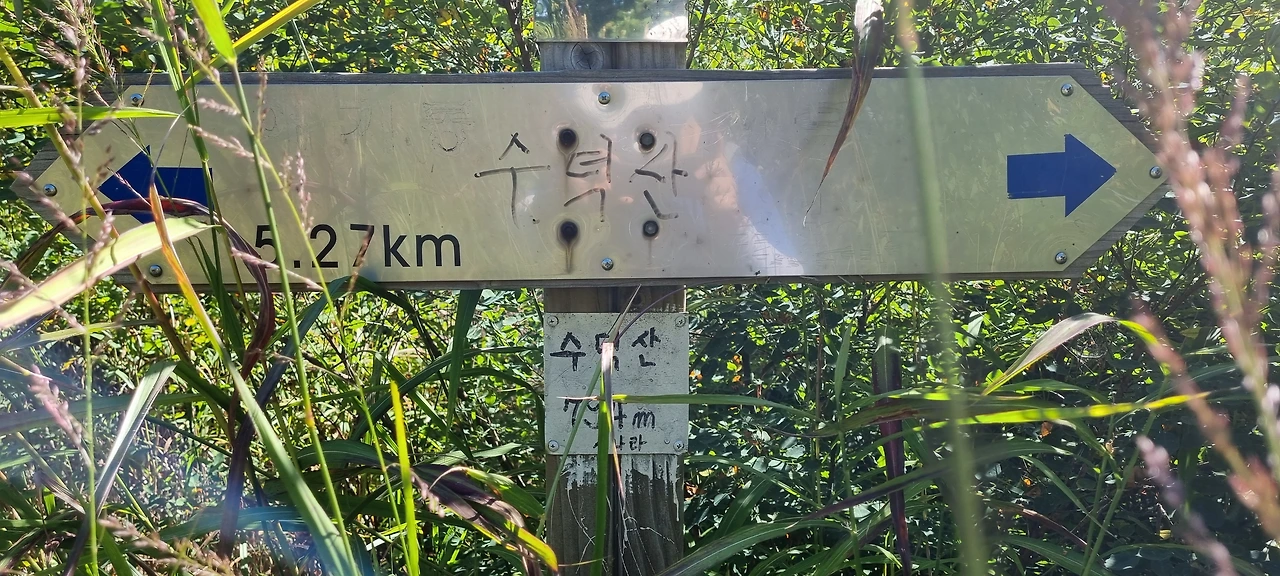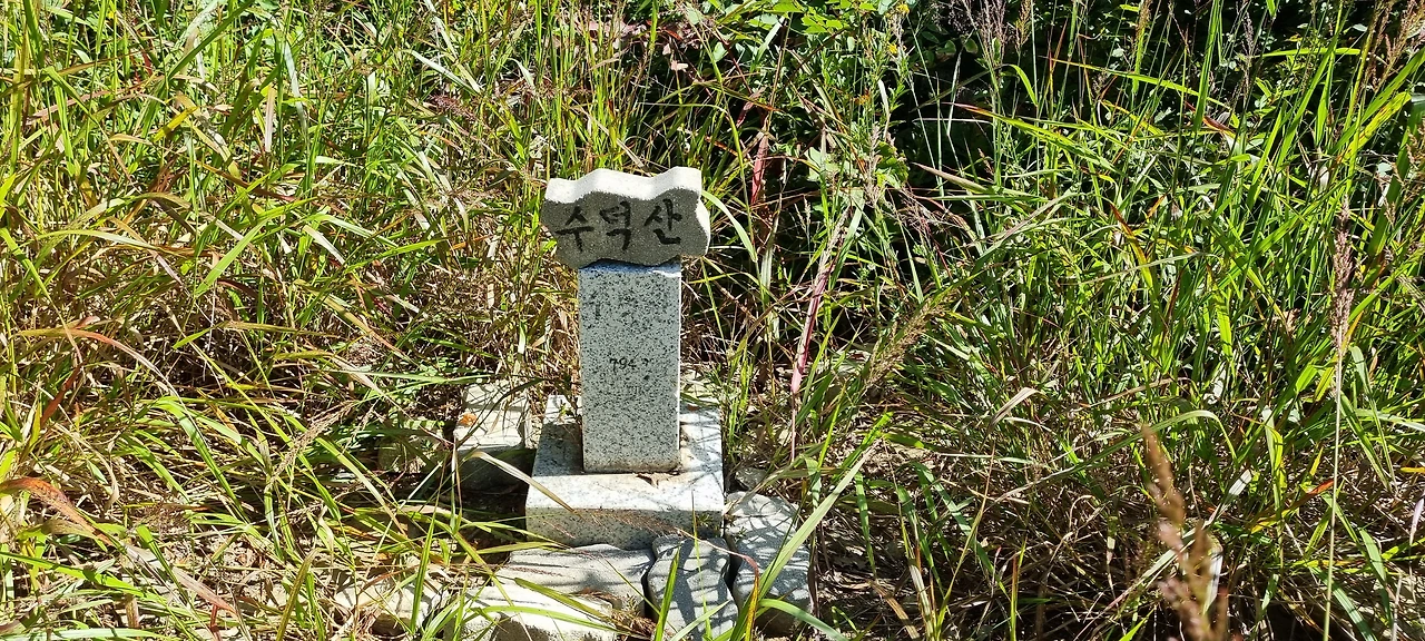 수덕산을 바로 앞에 두고 약수터로 가는 이정표가 보인다. 이제 우리가 갈 수덕산도 50m 남았다고 한다. 하지만, 그 50m가 500m나 되는 것 같다. 정상에 표지석도 간단하고 다만, 이정표만 반길 뿐이다. 애기봉으로 방향을 잡고 걷는다.