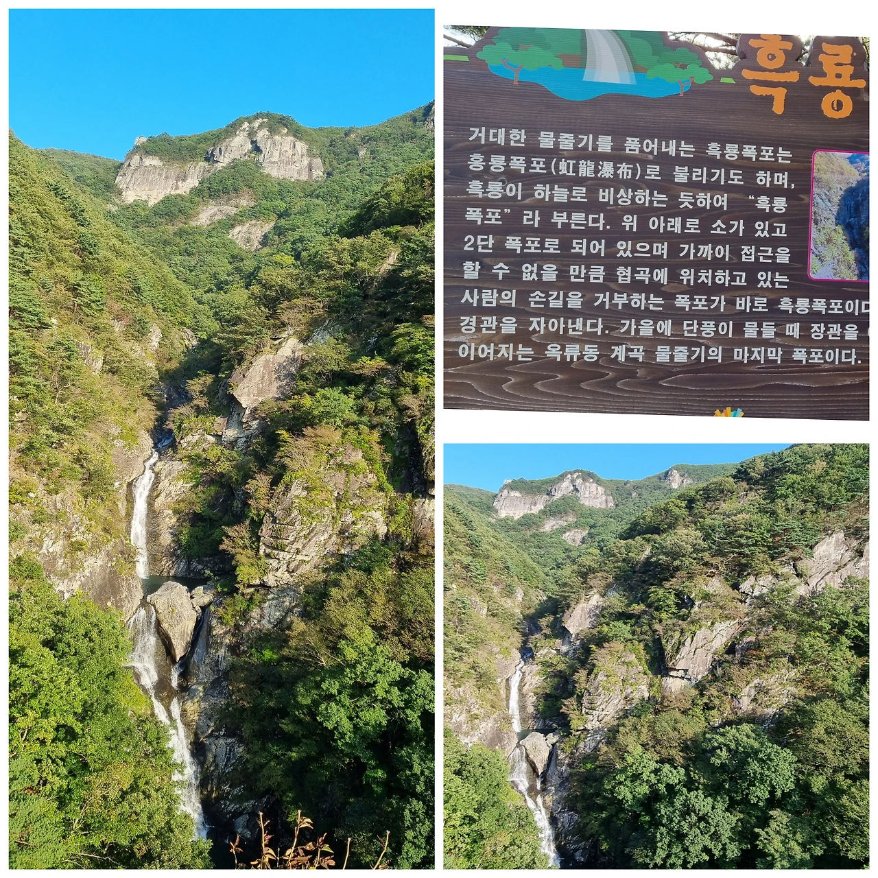 이름 없는 조그마한 폭포도 있고 그 폭포의 백미. 흑룡폭포에서 감탄하지 않을 수 없었다.옥류동 계곡이라고 한다. 흑룡폭포 전망대는 벼랑 끝에 미국의 그랜더 캐넌과 같이 만들어 절벽 밖까지 걸어나갈 수 있게 만들어 놓았다. 다만 미국은 유리로 바닥을 만들었고 이곳 철판으로 만들어 밑을 볼 수 있게 만든 차이가 있다. 그래도 끝에는 위험하니 조심하라고 한다. 이것을 보기 위하여 일부러 오는 사람도 있다고 한다.