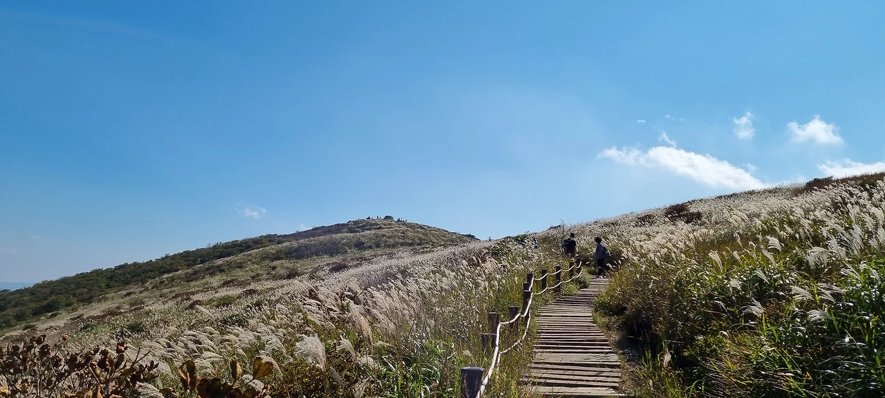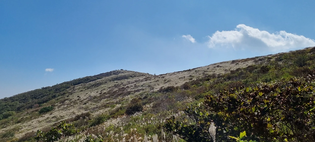 천황재로 내려서면서 아쉬움도 표할 시간이 없다. 그렇지만 뒤를 돌아보고 억새와 함께하는 천황산 정상을 담는다.