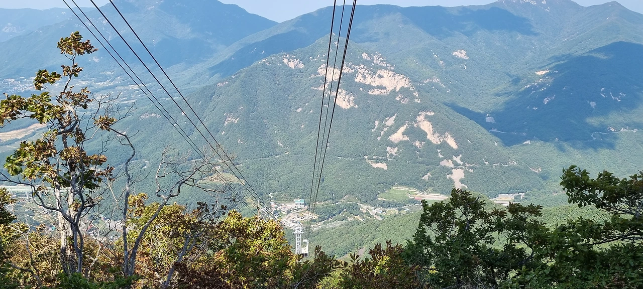 저 옆 능선이 백미라고 하는데 오늘은 못 간다. 시간이 제한된 산행에서 암릉은 2시간이 소요되면 일정에 문제가 될 소지가 있다. 오늘은 평범한 능선으로 오른다. 계곡길도 싫고 입장료를 내기도 싫다. 여름이 끝나가는 가을에 얼음골은 얼음골이 아니기 때문이다. 이때쯤에는 찬기운도 거의 없어진다. 7-8월 얼음골은 그 자체가 피서지가 된다. 올라오고 내려가는 케이블카를 보면서 완벽하지 않은 모습을 담을 수 없어 상부 정류장에 도착하여 그 모습을 담았는데 교차하고 있고 가지산 자락과 어울린다.