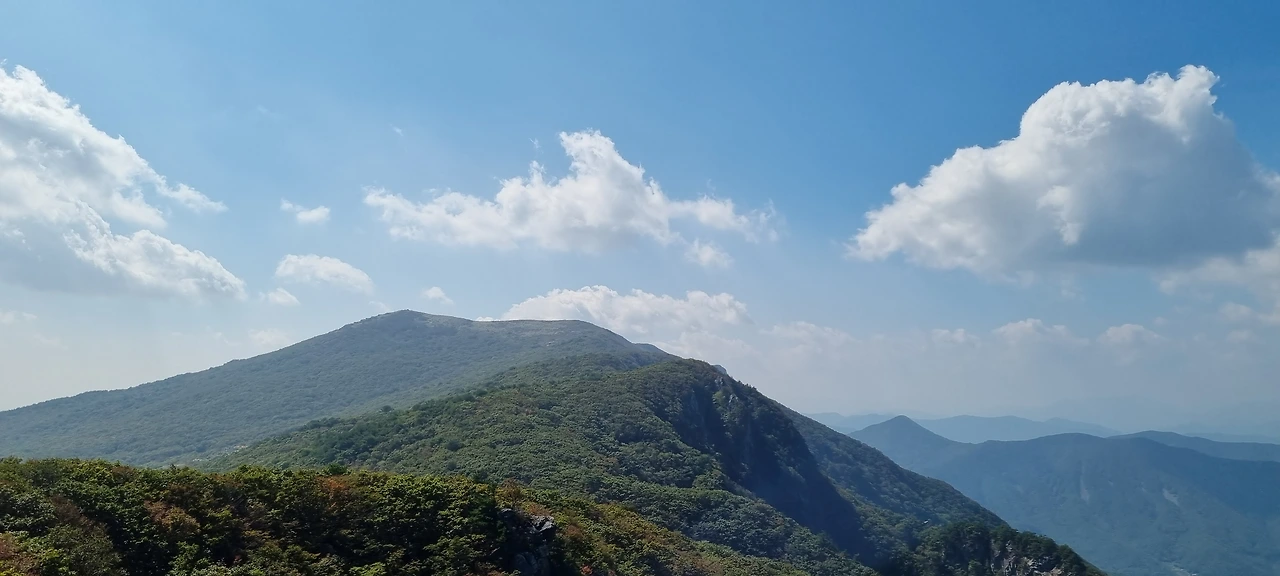하지만, 이곳에서 거북바위, 용바위 등에 대한 안내를 보고 얼음골로 향한다. 천황산 안내지도를 보고 갈등이다. 케이블카를 타면 10분 케이블카 능선길로 가면 3km 45분이라고 한다. 도립공원 안내도에 나온 지도를 보고 도전해보기로 한다. 얼음골로 가지 않고 들어서자마자 왼쪽으로 난 등산로에 접어들었다. 등산로에 사람이 한 명도 없다. 그래도 많이 이용한 흔적이 역력하고 관리도 되어 있어서 오른다. 3km를 45분에 오르는 것은 전문 산악인이나 가능할 것이다. 1시간 45분을 잘못 표기하였을 것이다. 가파른 능선을 오르고 또 오른다. 전망도 없다. 단지, 10분에 한 번쯤 케이블카 움직이는 소리가 난다. 등산객보다 케이블카를 관리하는 직원들이 오르내리는 경로로 보아야 할 것이다. 산을 오르면서 전망이 거의 없다가 살짝 보이는 곳에서 반대편과 옆 능선이 멋있어서 담아본다.