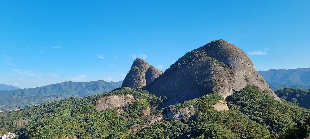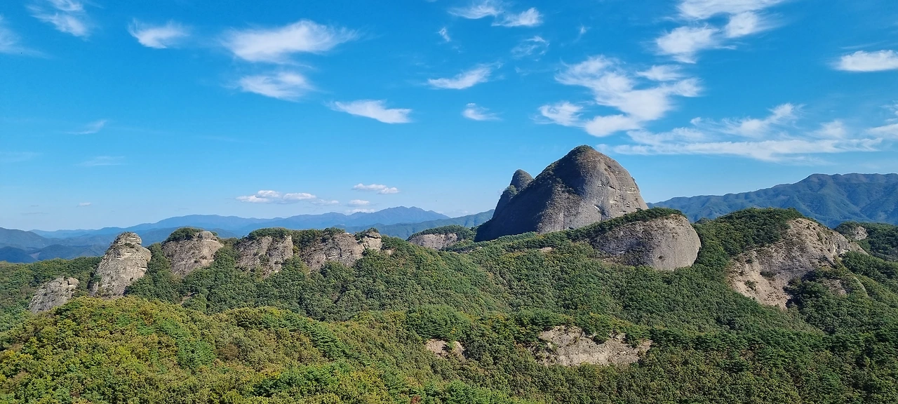 산에 듬섬듬섬있는 바위들이 푸른 나무들과 조화를 이루고 있다. 고금당은 금색을 띄고 우리를 부른다. 비룡대의 정자와 그 바위능선이 한껏 멋을 부리고 있다. 암마이봉을 올라오고 나서 숫마이봉을 못 올라간 것에 아쉬움을 전경을 남긴다. 암마이봉에서 주변을 멀리도 볼 수도 있고 암마이봉을 정상석의 필체가 특이하다.