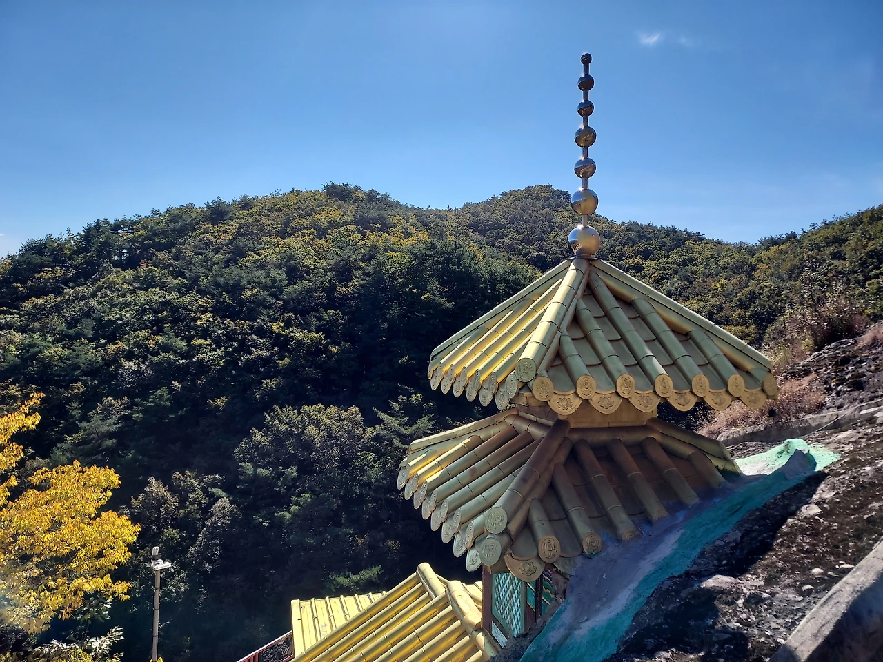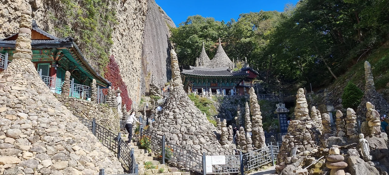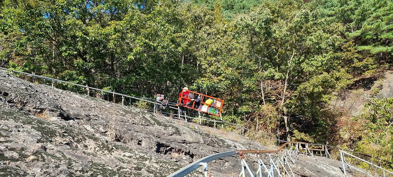 모노레일이 올라오고 있다. 산행을 다니면서 사찰에 모노레일이 설치된 것을 많이 보았는데 처음으로 이것을 타고 올라오는 신도들을 보았다. 재미있을 것 같기도 하고 무서울 같기도 한데 걸어서 올라올 수 없는 연세 드신 분과 몸이 불편한 분이 거리낌 없이 타고 올라오신다. 어쩌면 문명의 혜택이다.