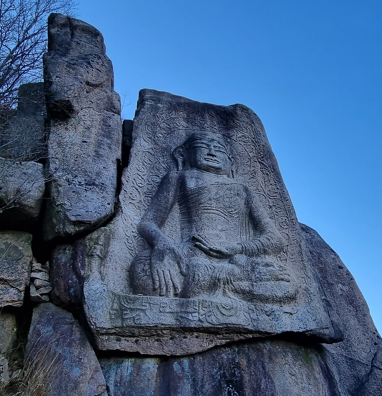 문화재청의 자료를 참고로 찾아보면 왼쪽 아래에 조그마한 상이 또 있다. 그리고 정교하게 조각되어 있다고 해야 될 것이다. 내가 마애여래좌상은 산을 다니면서 많이 보았지만 이렇게 정교한 것은 처음 보았다. 국보의 가치를 그대로 본 것이다. 가사도 흘러내리듯이 조각되어 있다. 1000년의 세월을 풍화를 견디면서 그대로 있다는 것이 신기롭다. 양각과 음각이 조화를 이루어서 그런 것 같다.