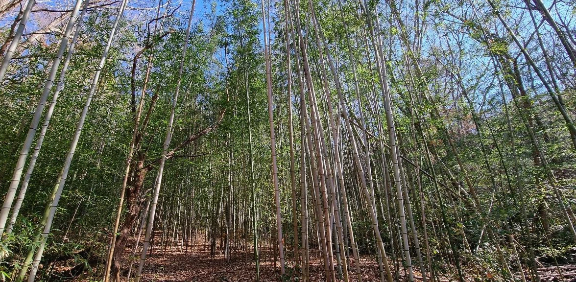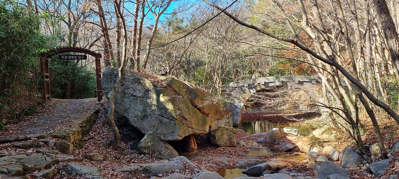 동백숲을 지나 도갑사 습지구역이라는 곳을 지나야 하는데 공사구간이다. 우회를 하라고 표시가 되어 있다. 자연관찰로 이다. 우회를 하라고 안내되어 있지 않아도 가보아야 하는 자연관찰로 이다. 나는 태어나서 아직 대나무 숲을 본 기억이 없다. 산을 다니면서도 산에 있는 조릿대만 보았지 큰 대나무들이 이렇게 자라서 숲을 이루고 있는 모습을 본 기억이 없다. 내가 태어난 곳은 추운 곳이고 그런 곳은 조릿대만 자라서 그런 것이다. 자연관찰로를 따라 올라가면 이렇게 대나무 숲에 오솔길을 만들어서 관찰하게 만들어 놓았다. 봄이면 죽순이 올라오겠지만, 지금은 초겨울이다. 대나무 밭에서 불어오는 소리에 의하여 음악이 울려야 하나 사람 소리만 요란하다. 나는 하산을 하지만 그들은 등산을 시작한다. 도갑사를 1km도 남겨두지 않아서 11시가 조금 넘은 시간에 이제 그들은 도착하여 산행을 시작하는 것이다. 원기 왕성하게 오르면서 떠들썩하게 지나간다.