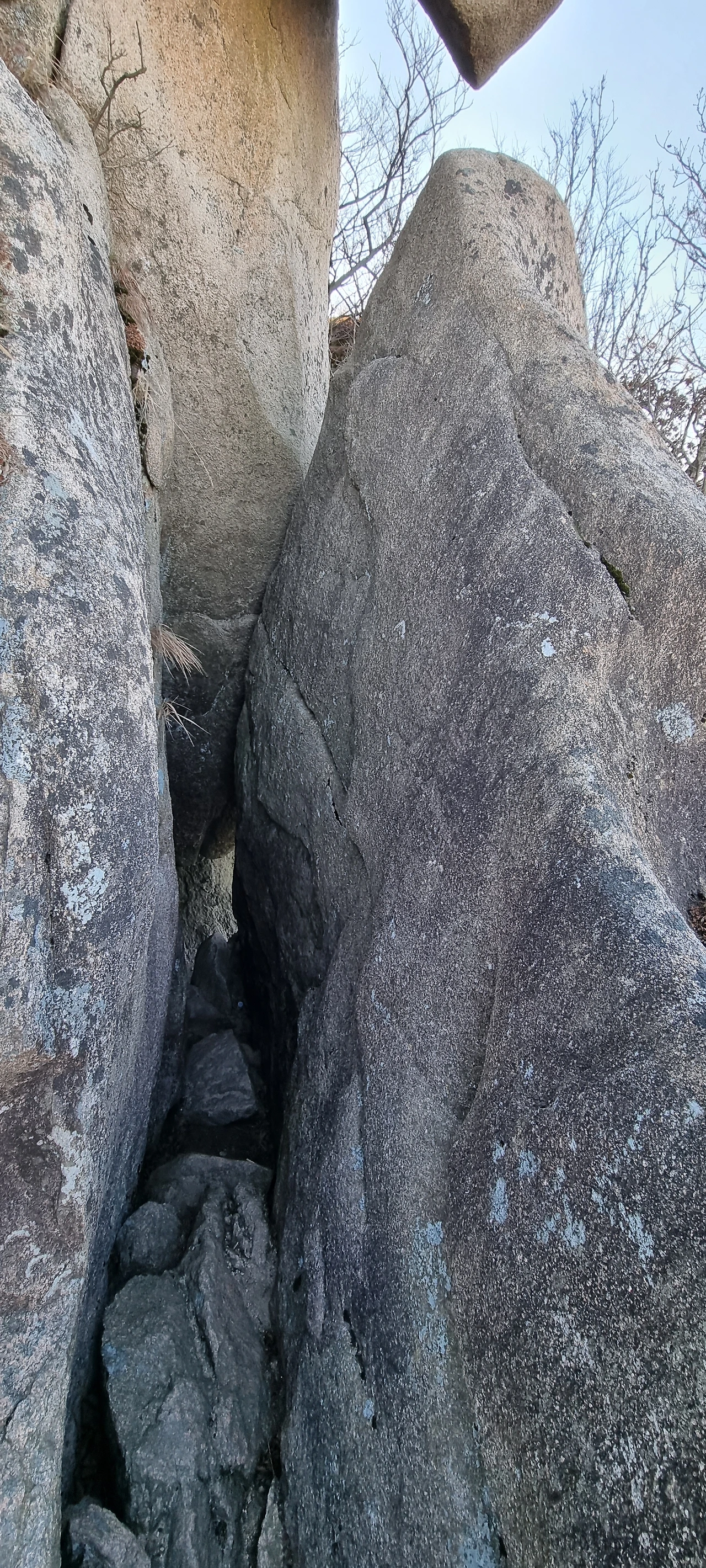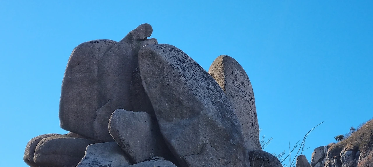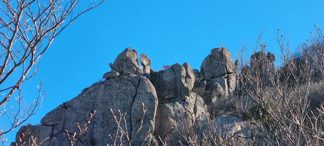 바위가 능선의 중간중간에 뚝 튀어나와 새로운 풍경을 만들어 낸다. 겨울이라 나무들이 낙엽을 만들고 떨구어 이제 새로운 풍경을 만들어 낸다. 그 풍경을 보면서 걷는다. 녹색의 향연이 있을 때에는 하얀 바위가 그 모습이 더 이채로울 수 있으나 이제는 하얀 나뭇가지 사이에 하얀 바위는 그렇게 뚜렷하게 보이지 않는다. 다만, 그 모양을 더 확실하게 볼 수 있다는 것에 감사를 할 뿐이다.