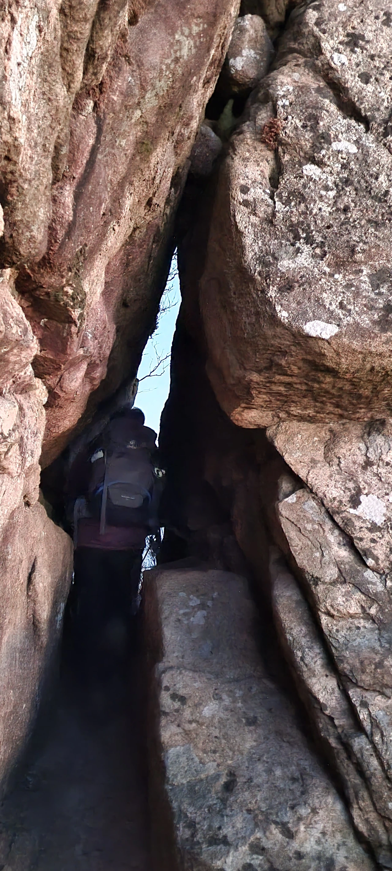 베틀굴은 지나 구정봉으로 간다. 베틀굴은 10m 남짓인데 이곳에서 임란 시절 여성들이 베틀을 설치하고 베를 짰다는 전설이 있다고 한다. 베틀굴은 그렇게 깊지도 않다. 사진은 생략한다. 이곳을 지나 구정봉, 마애여래좌상, 도갑사 갈림길을 만난다. 구정봉은 50m, 마애여래좌상과 삼층석탑은 500m를 갔다가 와야 한다. 구정봉을 지나치는 사람들은 없고 마애여래좌상은 내려갔다가 올라와야 하므로 지나치는 사람이 많다. 구정봉은 바위에 구멍이 9개 있다고 해서 붙여진 이름이다. 구정봉을 가는 길에는 한 명만 지나갈 수 있는 구멍이 있다. 속리산의 묘봉 코스에 있는 토끼봉을 올라갈 때보다 편하게 지나갈 수 있다. 토끼봉은 한 사람이 배낭 없이 맨몸의 줄을 잡고 앞으로 갔다가 다시 줄을 잡고 구멍을 빠져나와야 하지만 구정봉은 그냥 배낭을 메고 걸어 지나갈 수 있다.