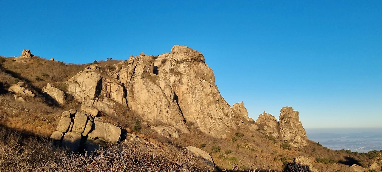 구정봉을 다시 가고픈 생각이 들어가는데 다시 한번 둘러보고 도갑사로 간다. 도갑사로 가면서 억새밭을 거쳐 내려가면 되어서 그렇게 의미 없을 것 같아서 시간을 어떻게 보내야 될까 고민에 싸였다. 걸어가면서 기암괴석을 보고 무엇을 닮았나 찾아보리라 생각을 하니 보인다. 여유를 갖고 걸을 뿐이다. 처음 접한 바위는 보는 모양에 따르다는 느낀다. 나는 하트 바위라고 지나가는데 보니 바위가 2개 있는데 방향에 따라 하트 모양을 이루고 있는 것이었다. 바위는 비와 바람이 조각을 한 것이다. 그리고 나무와 풀들이 옆에서 자라면서 바위가 서 있는 위치도 옮기기도 한다. 세월이 빛은 그 바위를 보는 것이다. 우리 선조들은 저 바위를 보고 무엇이라 했는지 알 수 없다. 다만, 후손들은 산으로 달려가는 선조들이 적어 놓은 기록을 보고 저것을 저렇게 불렀다고 알 것이다.