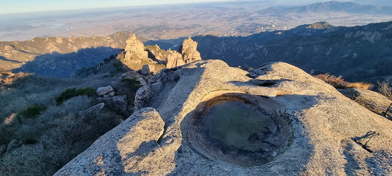구정봉에서 지금까지 온 천황봉을 바라보고 갈길을 바라다본다. 구정봉 위에 바위 웅덩이가 있고 그 웅덩이에 며칠 전 내린 비로 물이 가득하며 밤을 지새우며 살얼음이 얼어 있다. 구정봉에 무엇이 있는 것이 아니고 단지 시야가 좋아서 올라간다고 하여야 할 것이다.