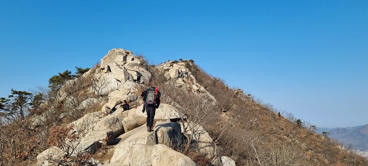 함허동천이라는 글자가 있는 곳까지는 포장된 도료이지만 등산로가 시작이 된다. 계단이 시작이 되고 계곡이 끝나는 지점에서 오른쪽으로 가면 오른쪽 능선, 왼쪽으로 가면 정수사로 갈 수 있다. 정수사로 가다가 능선으로 오르면 함허동천 암릉을 제대로 경험할 수 있다. 함허동천의 암릉지대를 오르면서 주변의 경치를 둘러본다. 어떤 분은 암릉을 오르고 내린다. 암릉 위에 있는 바위가 멋있어 한번 담아본다.