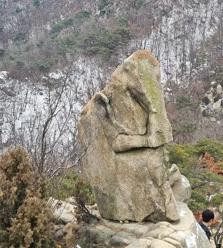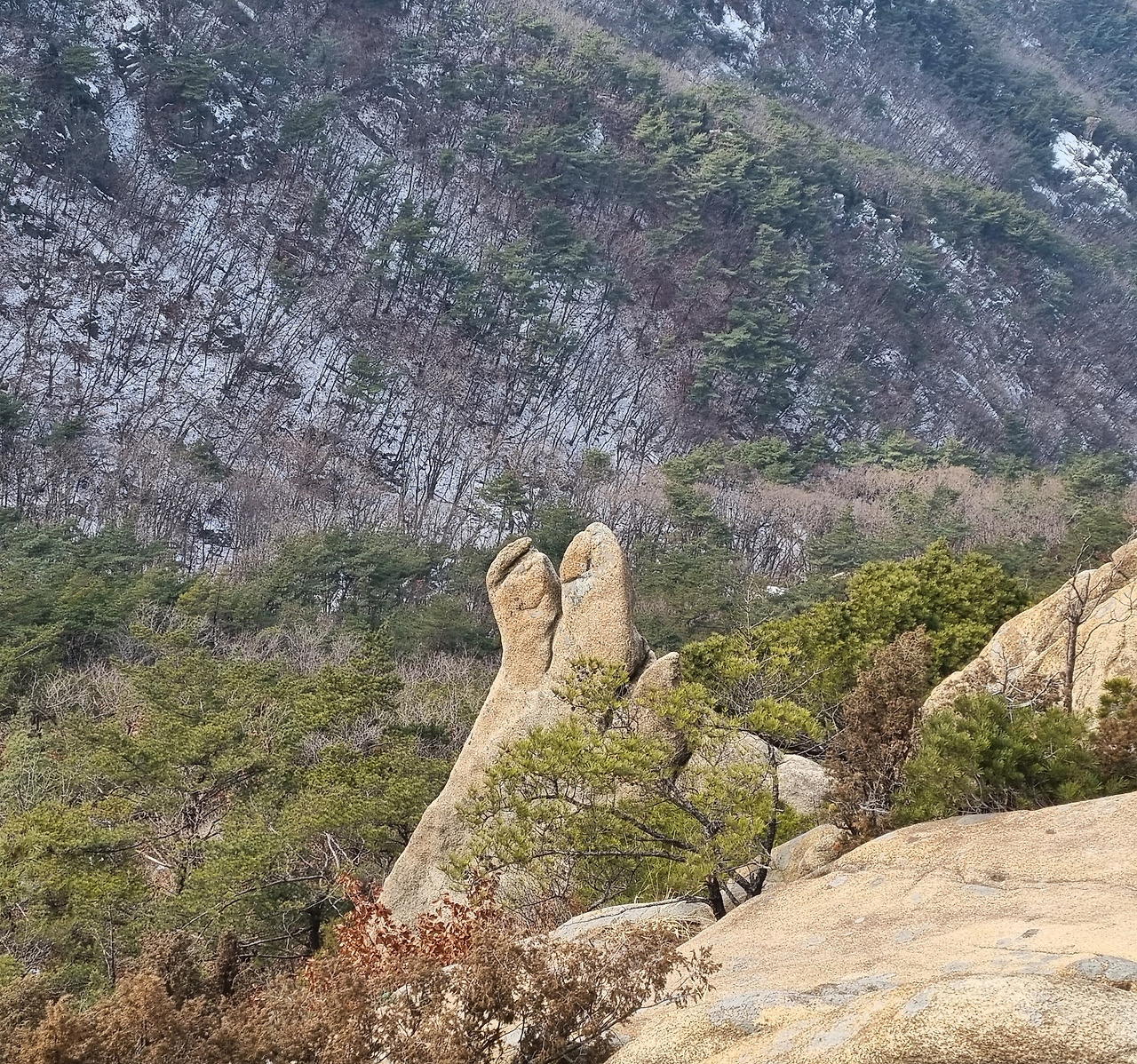 연주대 암자 바로 인근에서 보았다. 바위를 기어오르는 거북이가 있었다. 봄, 여름, 가을에는 나무가 있어 볼 수 없는 광경을 겨울에 보았다. 연주대 암자 바로 앞의 바위는 고양이 모양을 하고 있었다. 예전에 이곳에 일 년의 일출을 보려 온 기억이 있다. 이 바위 위에 앉아 아침해가 떠오르기를 기다리면서 찬바람을 이겨내 본 적이 있다. 한 번쯤 경험해볼 필요가 있다. 예전에는 솔봉을 오르는 것도 힘들었는데 이제는 쉽다. 솔봉에서 보는 일출도 재미있을 것이다.