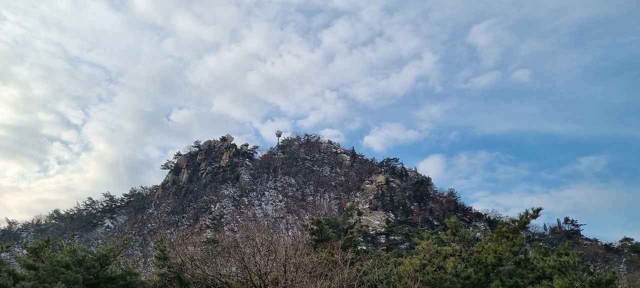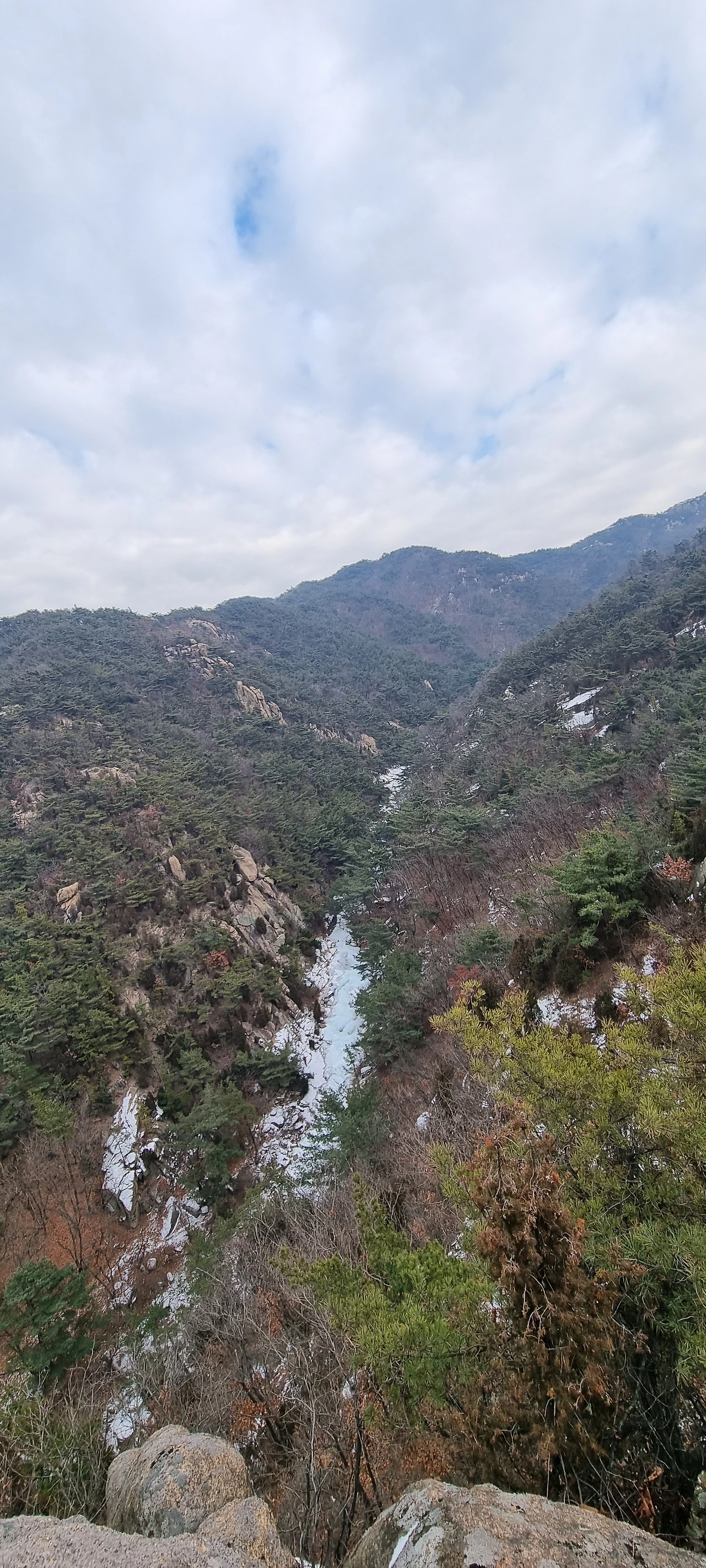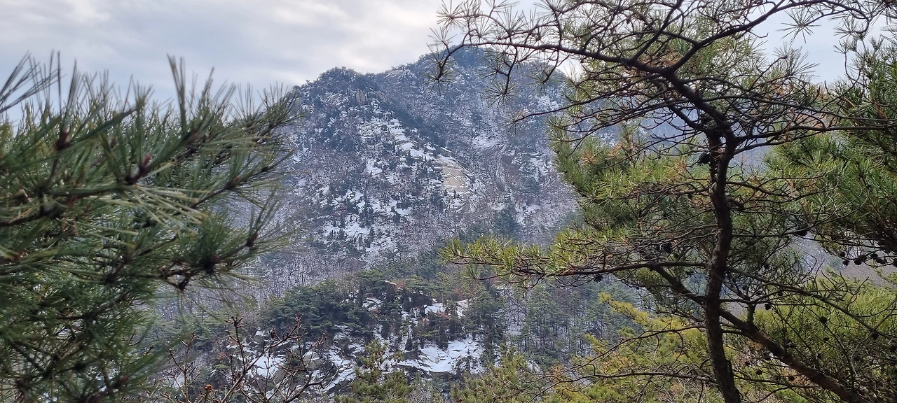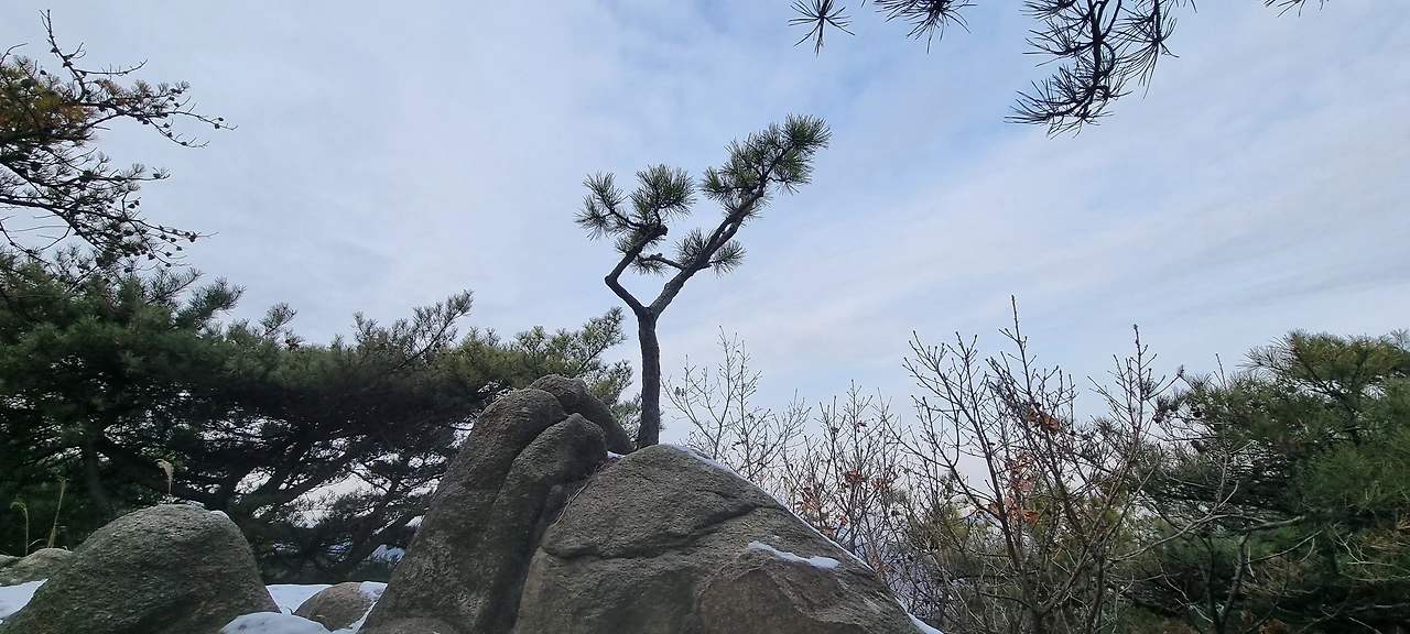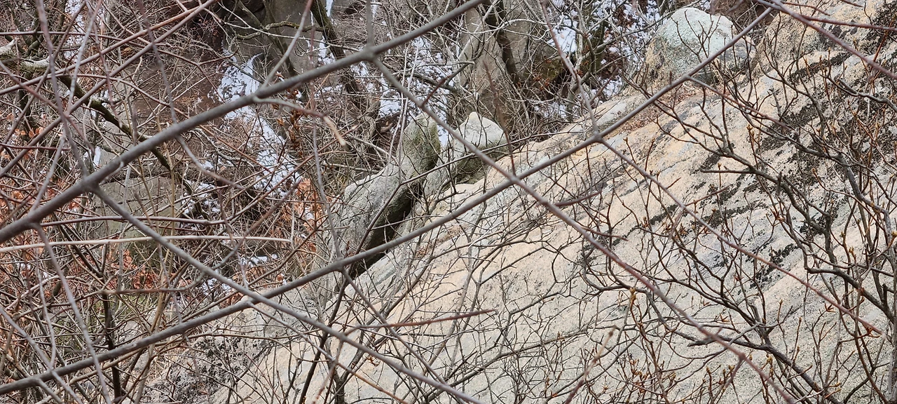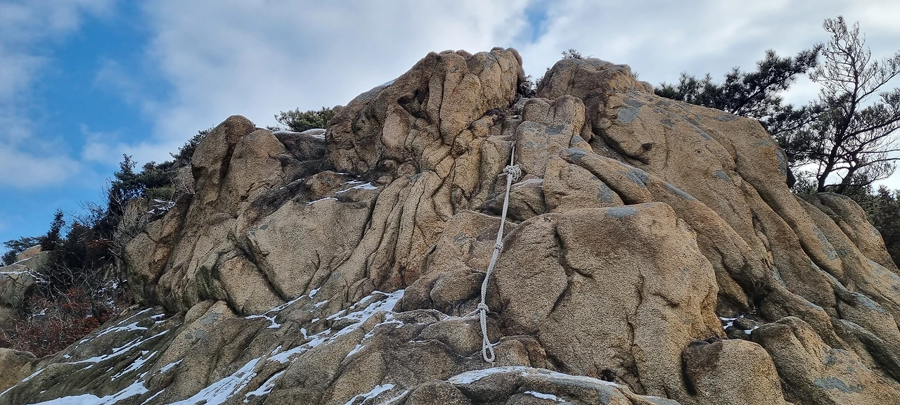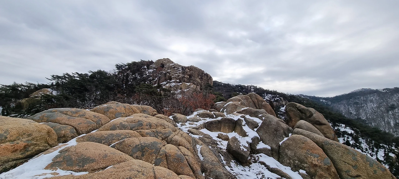 오늘도 걸으면서 사람들이 많이 다니는 길보다 사람이 없는 길을 찾는다. 오늘도 파이프 능선이다. 이 길은 처음이라고 한다. 계곡까지 내려가야 한다. 계곡을 내려가다 보면 왼쪽에 부대 영역이므로 이곳으로 들어가지 말라고 한다. 왼쪽 아래로 내려가지 않으면 된다. 너른 바위에 앉아서 담소를 나누면서 우리가 올라가야 할 능선을 바라본다. 며칠 전 내린 눈이 능선에 곳곳에 보인다. 바위를 따라 올라가야 하는데 부담스럽다. 하지만, 우리가 쉬고 있는데 산객이 먼저 지나간다. 저분이 우리 앞길을 열어 줄 것이다. 자신감을 갖고서 계곡까지 내려간 후 능선으로 오른다. 어떤 사람은 이곳이 어려운지 계곡을 따라 위로 올라간다. 내려가면 군부대이므로 그곳은 등산로가 아니다.
