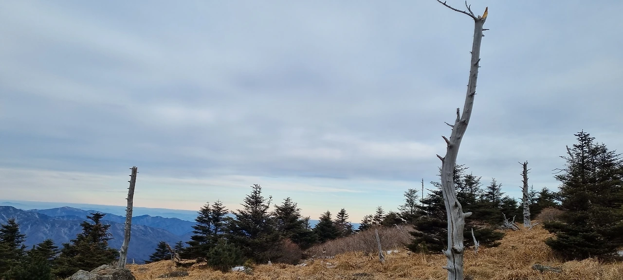 장터목대피소에서 오른쪽으로 내려가면 중산리 왼쪽으로 내려가면 백무동 직진으로 가면 천왕봉이다. 화장실도 가고 대피소 취사장으로 가고 시간을 보내면서 에너지를 보충한다. 제석봉을 오른다. 제석봉을 바로 오르면서 가파르게 오른다. 계단마다 얼음이 가득하다. 조심스럽게 오를 뿐이다. 올라가는 것이 내려오는 것이 힘들다. 그래도 나는 오른다. 제석봉에서 고사목을 보고 이제 고사목을 제치고 구상나무들이 자리를 잡아가고 있다. 저 고사목들이 불법적인 도벌꾼들에 의하여 발생한 것인데 제석봉의 운치를 보여주고 있다는 것이 아이러니하다. 뒤돌아보면 연하봉을 비롯하여 봉우리들이 한층 한층 쌓여있다. 멋있는 운치를 그대로 보여준다. 장터목대피소에서 밤을 지새우고 천왕봉에서 일출을 보기 위하여 이른 새벽 이 봉을 오른 기억이 있다.