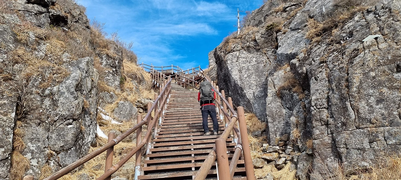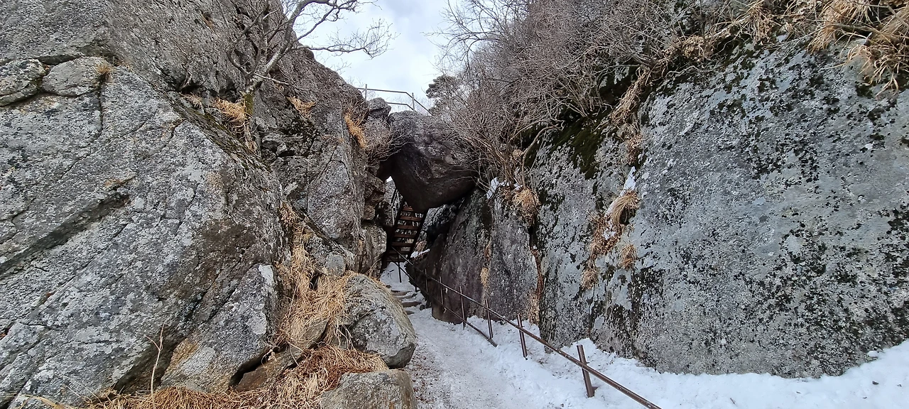 중산리로 내려가면서 가장 유명한 것이 개선문과 천왕샘이다. 가파른 계단을 내려서면 천왕샘이고 개선문이다. 가파른 계단을 내려오면서 내가 걸은 길을 돌아본다. 천왕봉을 옆으로 하여 제석봉과 연하봉 등의 능성이 그대로 보여주고 아래로 층층이 능선이 이어졌다. 여름이면 천왕샘에 물이 있겠지만 겨울에는 없다. 겨울에 눈도 없다. 그늘진 곳에는 눈이 아니고 얼음이 있다. 그래도 중산리까지 내려가는 길은 가파름의 연속이기 눈이 없기를 바라면서 내려간다. 어느 곳에서도 눈을 보지 못하고 그냥 바위계단을 내려간다. 힘겹게 내려가는 사람들도 있고 올라오는 사람들이 교차하는데 내려가는 사람들이 더 힘든 표정이다. 무릎이 피로하여서 이를 보호하기 위하여 천천히 내려간다. 올라오는 사람들은 그래도 힘들지만 한 번쯤 쉬면 에너지가 보충되지만 무릎은 쉽게 회복되지 않기 때문이다.