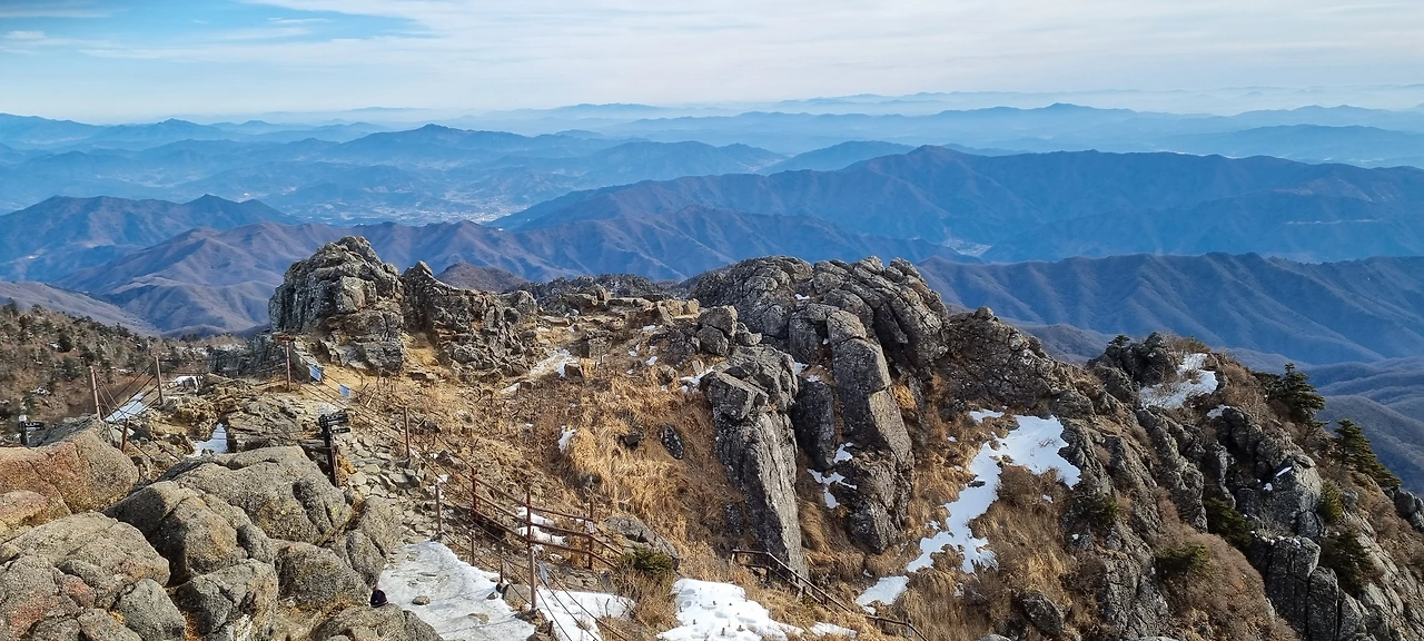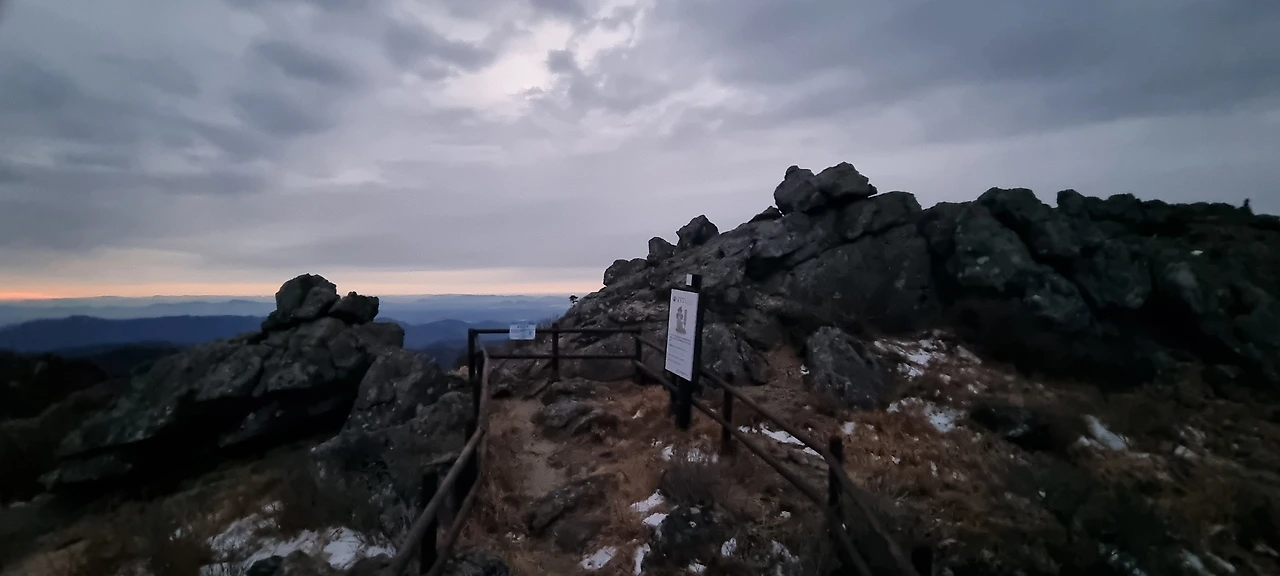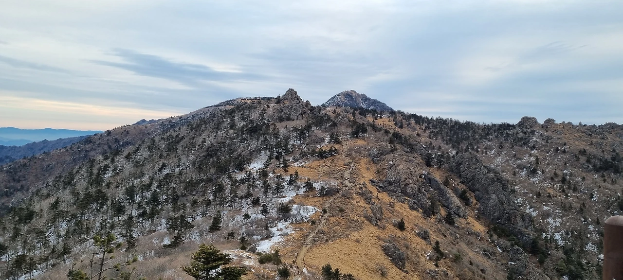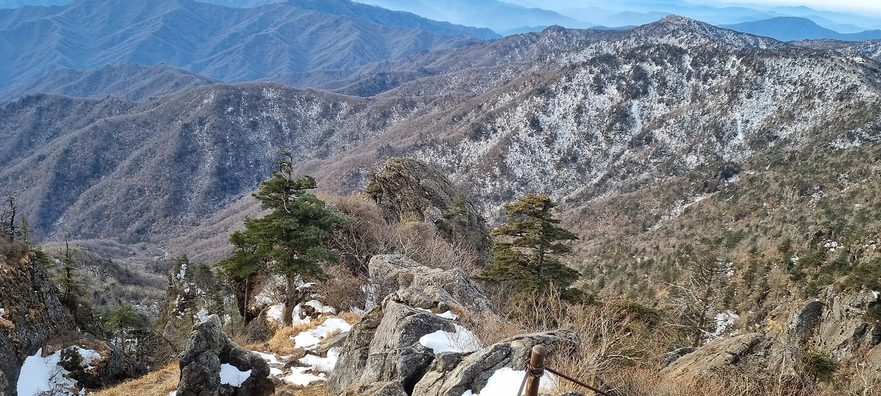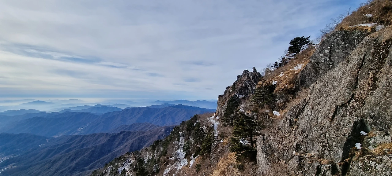 이제 연하선경을 보러 간다. 연하선경은 세석에서 장터목 구간을 이르는 말인데 실제적으로는 연하봉을 오르기 직전의 아름다운 능선길을 말한다. 능선을 따라 오솔길이 멋있게 나있다. 여름이라면 감상할 수 있는 바위에 앉아 시원한 바람을 만끽하겠지만 오늘은 아니다. 찬바람을 몰아치고 있다. 촛대봉까지는 발에 아무렇지 않게 걸을 수 있었으나 촛대봉을 내려가려고 보니 미끄럽다. 이제는 발밑에 아이젠이 필요하다. 천왕봉까지 아이젠은 필수다. 음지다. 이제는 밝아졌다. 언제 일출이 있었는지 모르지만 그래도 일출이 있었다. 거친 바람이 얼굴을 때린다. 다만, 눈은 바닥에 깔려 있을 뿐이다. 양지바른 곳은 눈이 없다. 해발 1700m 고지에도 눈이 없다. 사실 중산리로 내려가는 길은 해발 1900m이지만 없는 것이 사실이다.