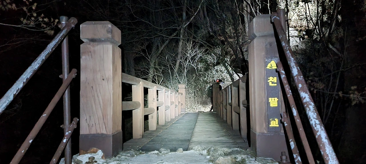 거림에 탐방안내소에서 걸어서 15분 거리에 있는 주차를 하고 너도나도 잠을 깨우면서 등산장비를 챙긴다. 헤드랜턴을 머리에 쓰고 겨울용 모자를 쓰고 산으로 하나둘 간다. 헤드랜턴을 쓴 산객들이 마을을 지난다. 개들이 짖을 것이라고 생각했는데 이 동네 개들은 조용하다. 새벽에 산으로 올라가는 사람들이 많아서 그런가 본다. 거림에서 세석대피소까지는 3시간이면 오를 수 있다. 밤을 친구 삼아 걸으면 주변 어느 것도 볼 수 없기에 발걸음은 빨라질 수밖에 없기에 6km 거리가 3시간이 아닌 2시간 30분 이내에 오를 수 있다. 하지만, 오늘은 시간적 여유가 너무 많아 빨리 가는 사람은 빨리 가도록 길을 비켜주면서 천천히 걸어 오른다. 3시간을 목표로 하여 걷는다. 어둠속에서 등산로가 잘 보이는 곳도 있고 보이지 않는 곳도 있다. 세석에 도착하기 바로 직전 바로 오르는 코스와 옆으로 가는 가는 코스가 있는데 바로 오르는 코스를 가다가 얼음으로 등산로가 되어 있어 다시 옆으로 가는 코스로 간다. 알바를 한 것이 아니지만 잘못 선택한 길을 바로 잡는 것이 쉬운 것은 아니다. 세석에 도착하지까지 계곡을 따라 올라가는데 능선 위를 지나가는 바람소리가 무섭게 울고 있다.