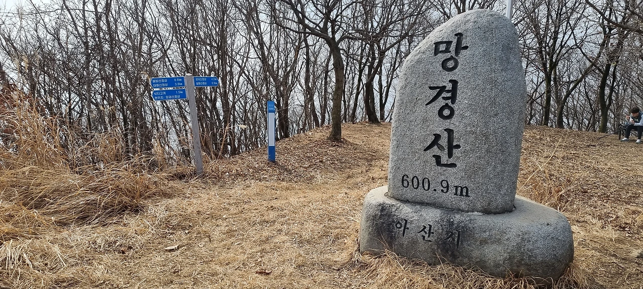 이곳에서 장군봉으로 간다. 장군바위가 있다. 그런데, 이곳까지 왔는데 산행을 시작한 지 2시간도 지나지 않았다. 그래서 이곳에서 3km 떨어져 있는 망경산을 갔다 오기로 한다. 산행을 와서 3시간 만에 하산을 하는 것은 너무 아쉽다. 그래서 망경산까지 걸어본다. 망경산까지 갔다 오는 길은 조망이 없다. 단지 오르고 내리고 그것뿐이다. 망경산에서 바라다보는 것도 그렇게 없다. 단지 산아래 마을과 저수지가 있을 뿐이다. 망경산(望京山)의 지명은 ‘경(京)’은 한양 혹은 임금을 상징하여 나라에 상(喪)을 당하면 한양을 향해 망배(望拜)나 망곡(望哭)하던 곳에서 유래하였다고 한다. 해발이 601m로 그렇게 높지 않은 산이다. 하지만 이곳에서 601m는 많은 산을 조망할 수 있다. 이곳은 아산에 위치하고 있으면서 천안을 조망할 수 있다고 하는데 오늘은 아무것도 볼 수가 없었다. 미세먼지가 멀리 볼 수 없게 제약을 한 것이다. 정상에는 헬기장이 잔디가 햇빛을 받아서 부드럽게 자라고 있다.