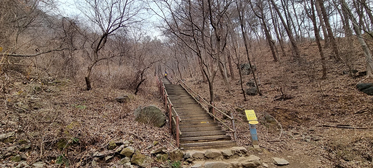 광덕사를 지나서 광덕산을 오르는데 장군봉을 가는 갈림길을 지나자마자 계단이 나타난다. 계단 숫자는 500개가 넘을 것이다. 계단을 오르고 오르다 보면 정상길로 5 지점까지 가야 해제된다. 계단을 힘겹게 올라온 사람들이 쉴 수 있도록 정자도 있고 의자도 있다. 그리고 그냥 지나가는 사람들을 위하여 등산로는 100m 정도 오른쪽으로 방향을 틀면서 편하게 걸을 수 있다. 능선에 도착하면 다시 오른다.