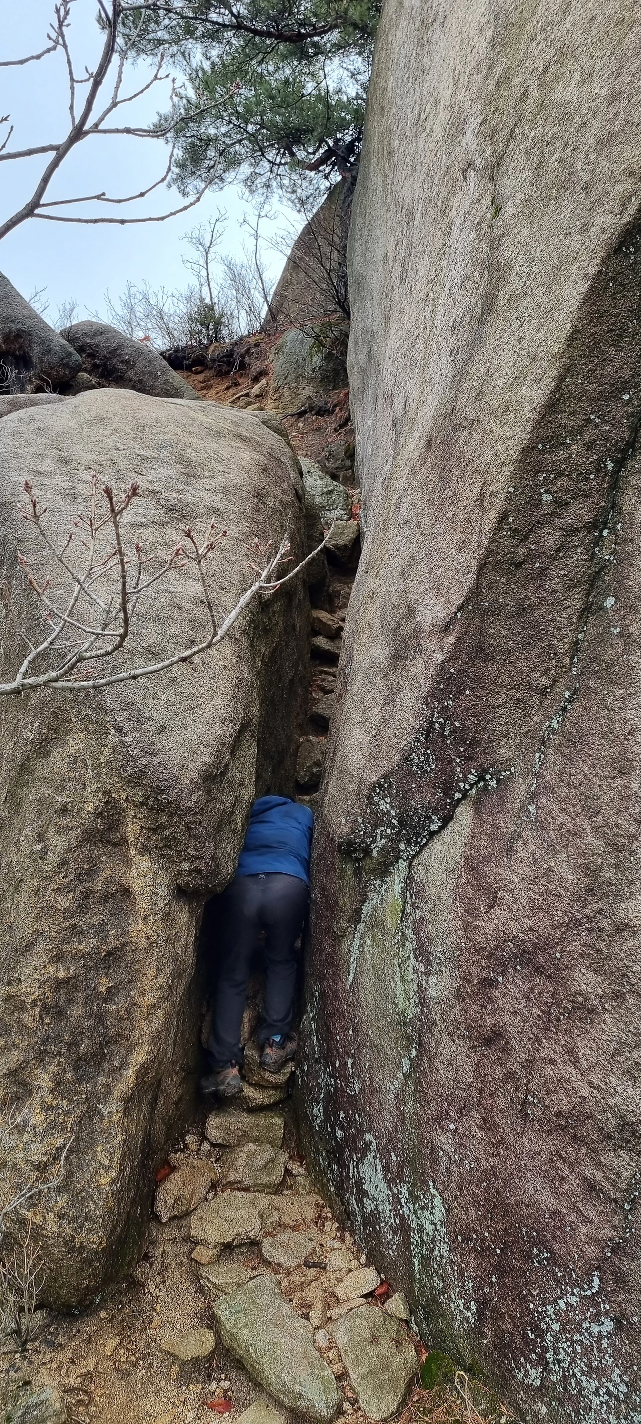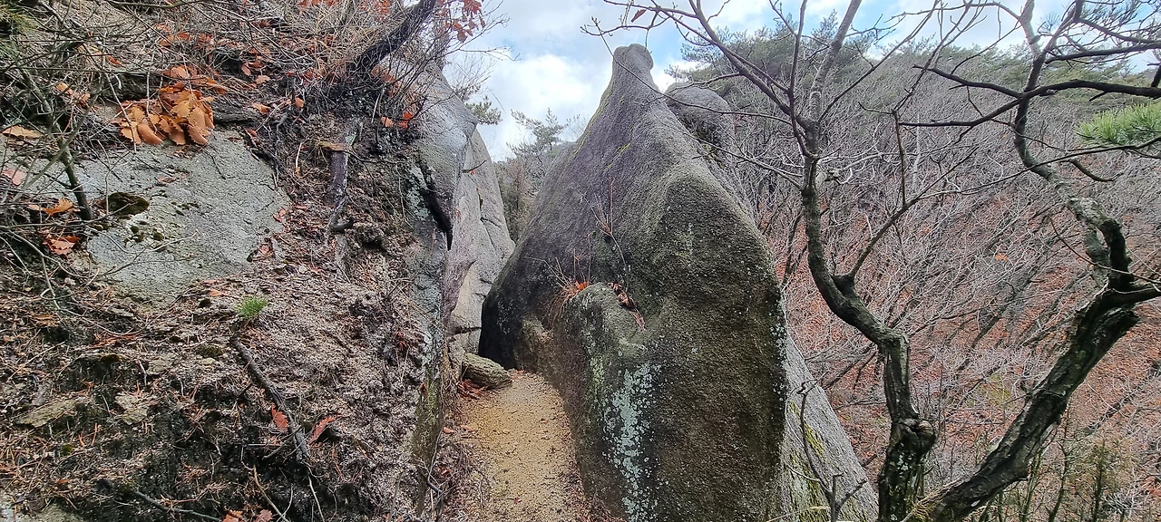내려가면서 등산로를 벗어나는 지점에 있는 보루를 가기 위하여는 등산로를 이탈하여야 한다, 보루에 대한 설명이 있고 출입금지 표시가 되어 있다. 올라오는 곳에는 없는데 내려가는 곳에는 있다. 바위와 바위 사이에 난 길을 통해서 바위를 올라가 본다. 예전에는 이곳이 무엇이었다는 것을 알려주는 표지석이 있었는데 이제는 제거가 되어 있다. 문화재를 관리하기 위하여 이곳을 그렇게 관리하는 것인지 모르겠다. 아무도 찾지 못하게 멀리서만 볼 수 없게 하는 것보다, 접근을 할 수 있게 하는 것도 한 방법일 것이라고 본다. 바위 사이에 난 길은 좁다. 한 명이 지나가기에도 좁다. 날씬한 사람이 옆으로 하여 지나갈 수 있다. 이러한 곳에 보루를 설치하여 놓으면 적군은 이곳을 올라올 수 없는 것이 사실일 것이다. 바위 위에 물만 있다면 문제가 없을 것인데 하는 아쉬움이 있을 뿐이다.