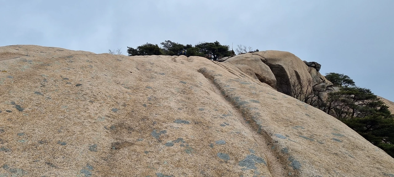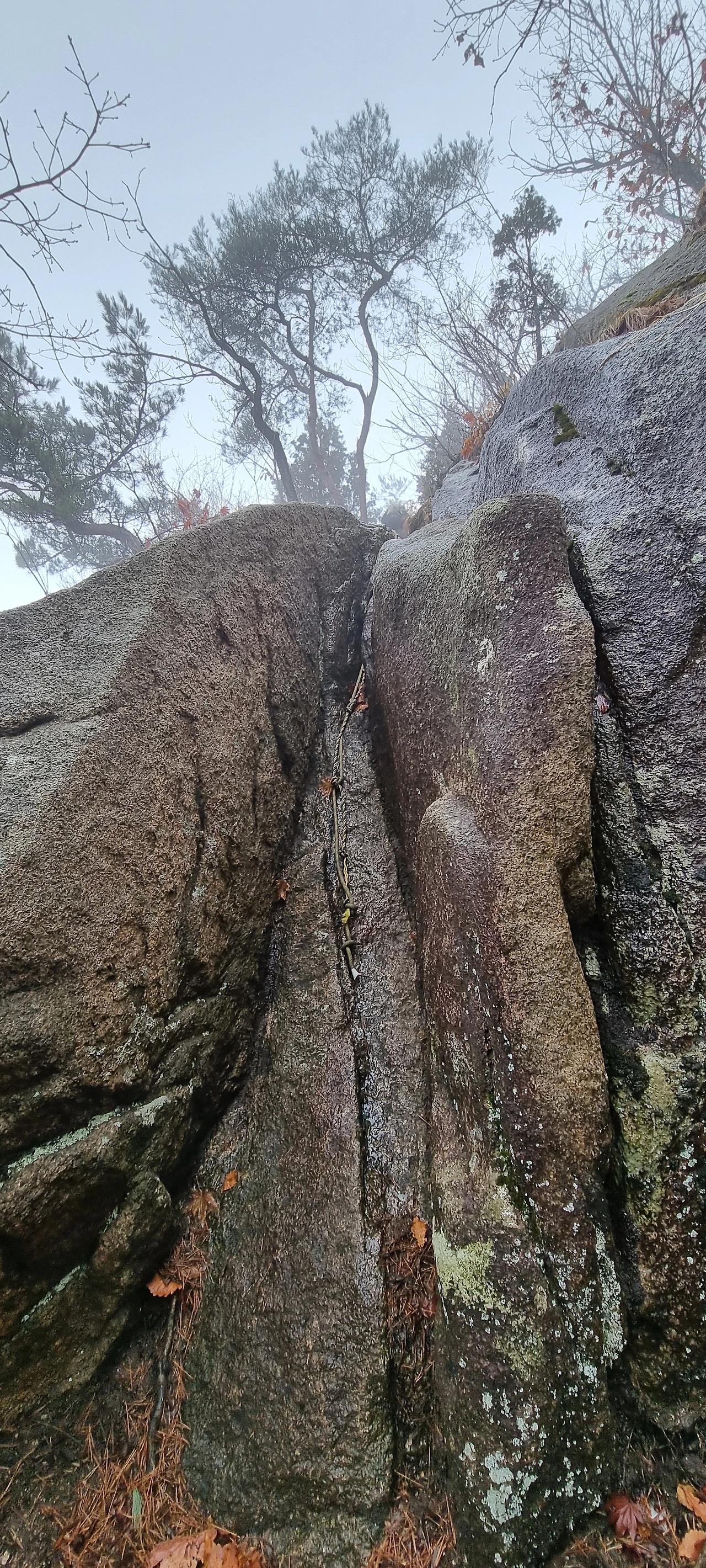 다시 올라간다. 등산로를 이용하여 사패능선까지 올라간다. 그리고 사패산 정상에 도착하였다. 사패산 정상에 도착하여 멀리 도봉산을 본다. 도봉산이 이제는 정상에만 활성 안개에 싸여있을 뿐이다. 그리고 그 속에 있는 도봉산의 자태를 순간적으로 보여주었다. 숨겼다 한다. 자태를 순간적으로 보여주었을 때 그 모습이 멋있다. 아름답다. 그리고 사패산을 바위 끝으로 내려가 본다. 바위가 이곳에 자리 잡고 억겁을 지나서 그런지 빗물이 흘러서 바위에 골이 파여 있다.