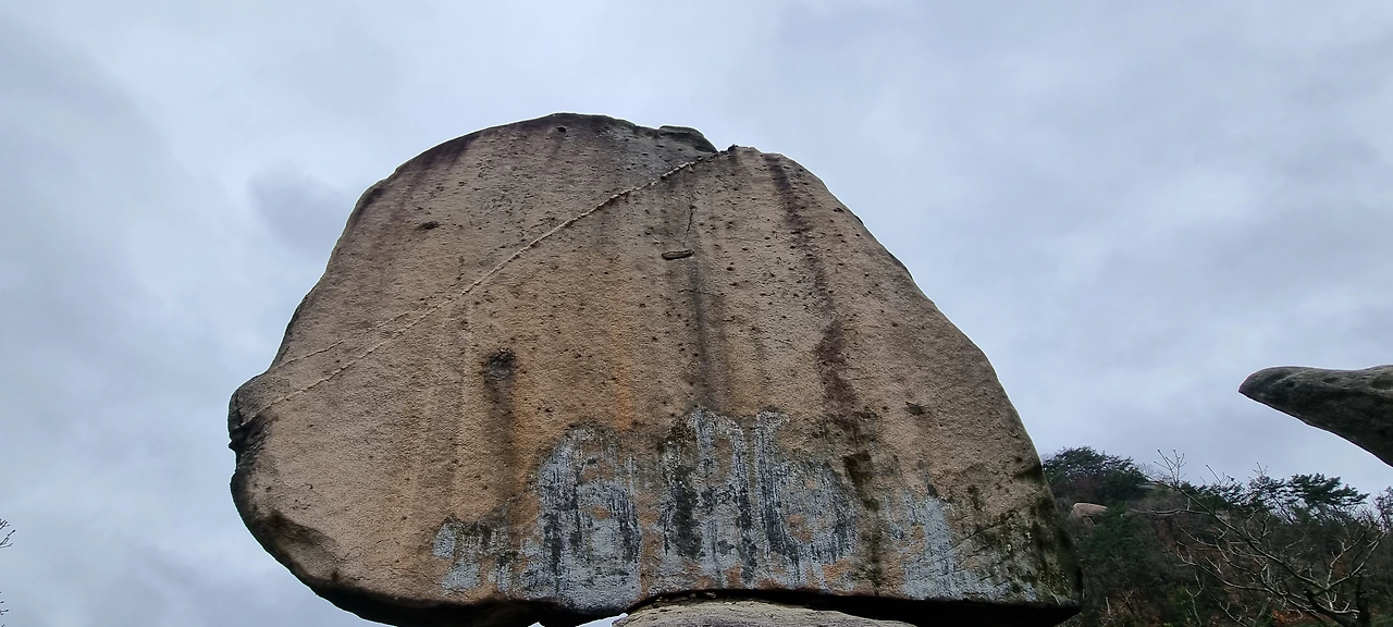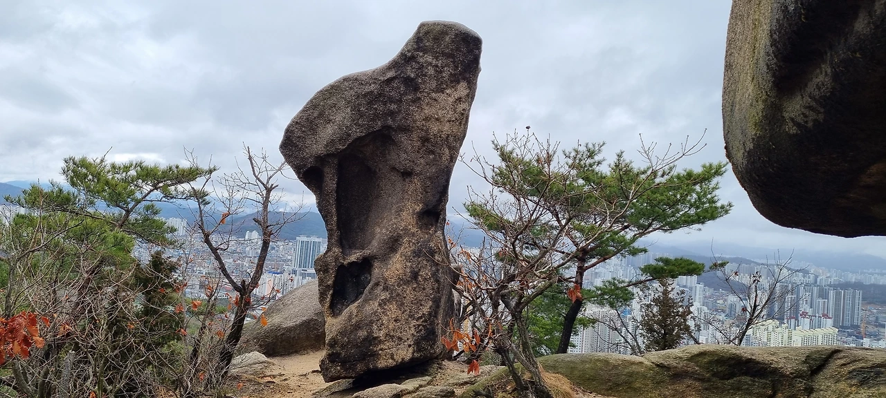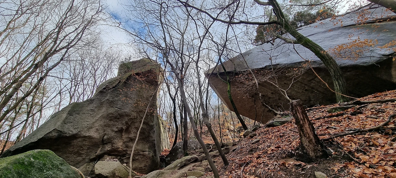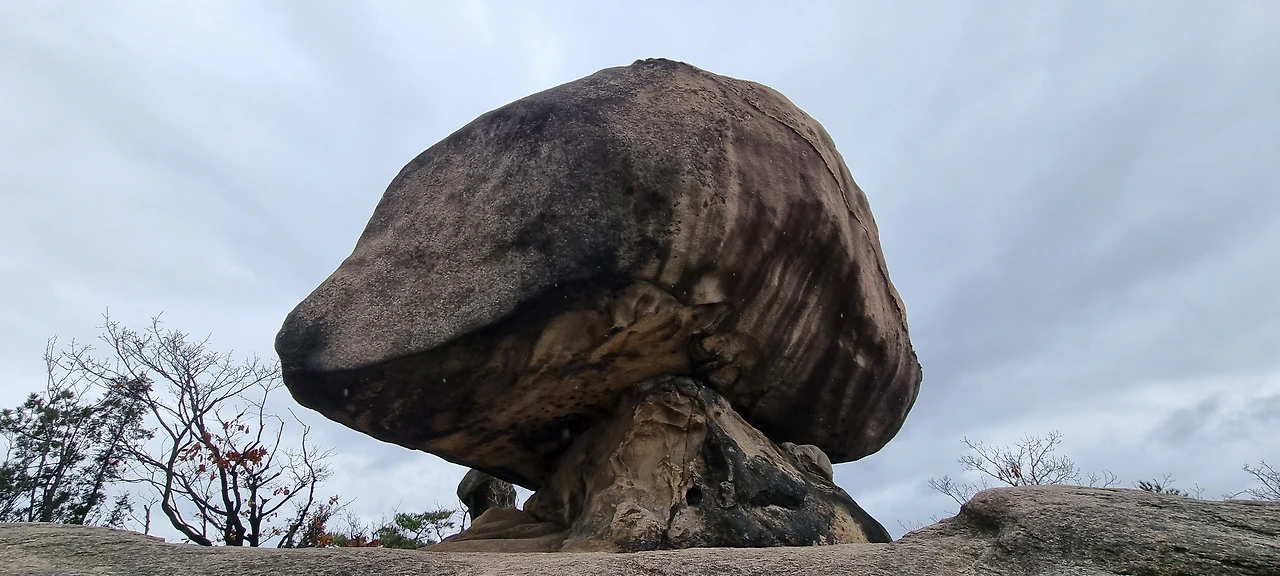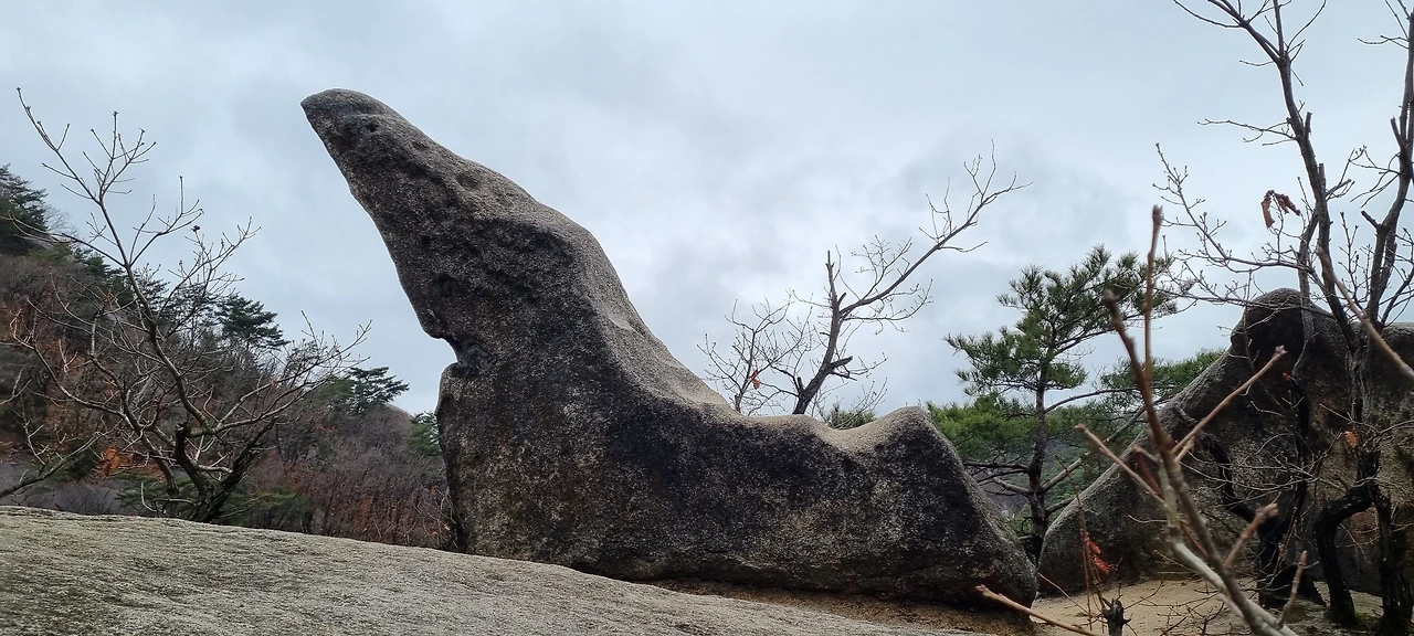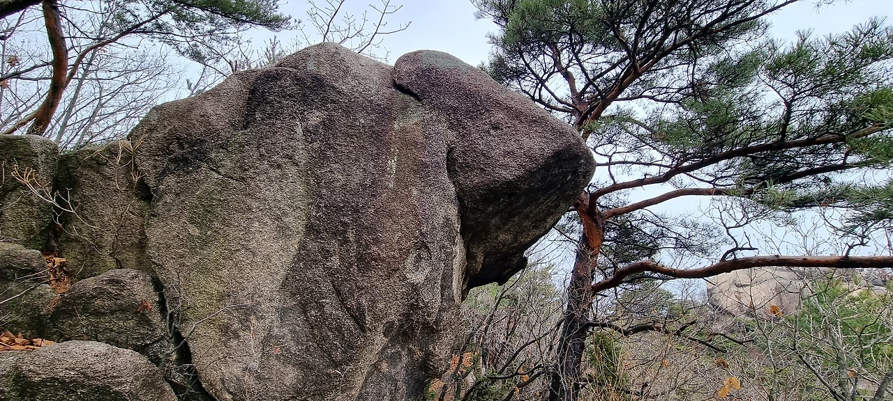 보루를 내려와서 사과 바위라 하기도 하고 버섯바위라고 하는 바위가 있는 곳으로 간다. 등산로에서 그냥 사람들이 내려간다. 하지만, 왼쪽으로 난 등산로를 이용하여 가면 볼 수 있는데 사람들이 지나친다. 우리는 이것을 보기 위하여 이리로 간다. 처음에 본 순간 버섯바위라고 하였는데 돌아가서 보니 바위가 반쪽으로 갈라져 있는 것처럼 보인다. 친구는 사과 바위라고 한다. 나는 물고기 바위라고 한다. 각자 생각하기 나름이다. 이웃한 바위는 한반도 바위라고 하는데 그 모습이 뒤에서 보았을 때는 물개바위다.