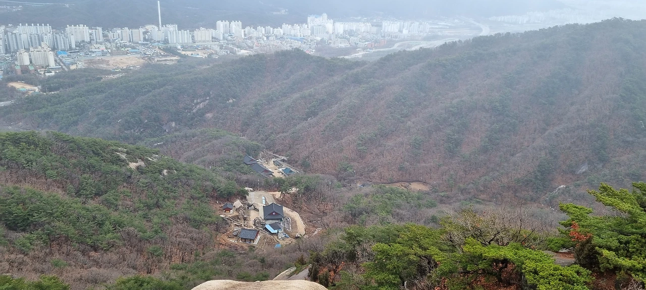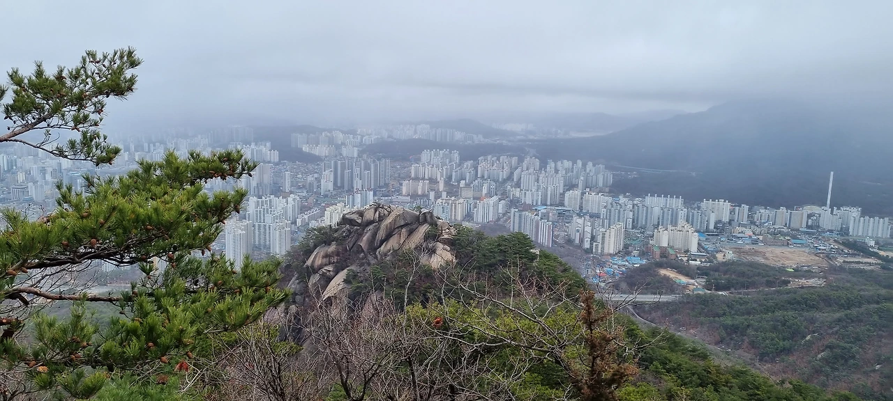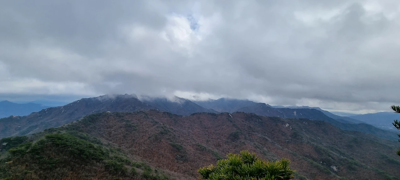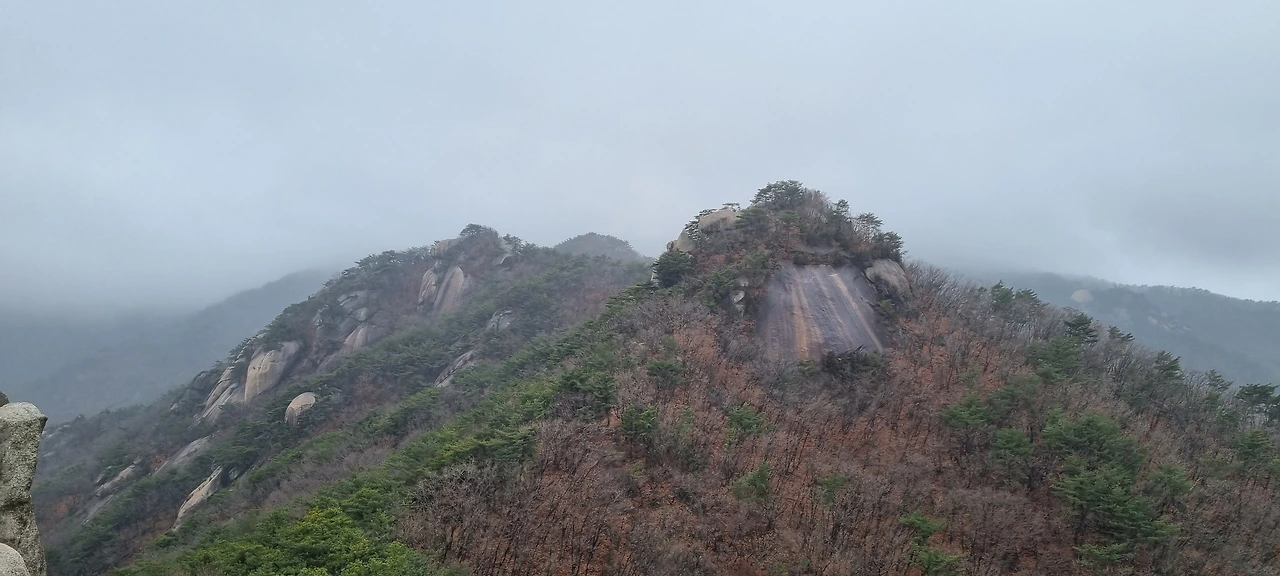 사패산을 가는 방향에서 의정부의 범골에서 올라오는 등산로를 만났다. 우리는 이 길을 내려갔다가 올라올 것이다. 범골에서 올라오는 길에 고구려의 보루가 2개 있으며 전망대가 있다. 보루(堡壘)는 적군을 막거나 공격하기 위해 흙이나 돌로 튼튼하게 쌓아놓은 진지이다. 사패산 보루는 전부 3곳이다. 그 위치는 정상부에 있는 것이 아니라 정상부를 중심으로 돌아가면서 작은 봉우리에 있다고 한다. 오늘은 그중 2곳만 둘러볼 것이다. 범골로 내려가면서 보루 2개를 보고 마지막으로 버섯바위인지 사과 반쪽 바위를 보고 다시 올라올 것이다. 내려가다가 첫 번째 지점은 전망대이다. 산을 내려오면서 보니 활승안개가 많이 걷혔다. 그래도 도봉산은 아직이다.