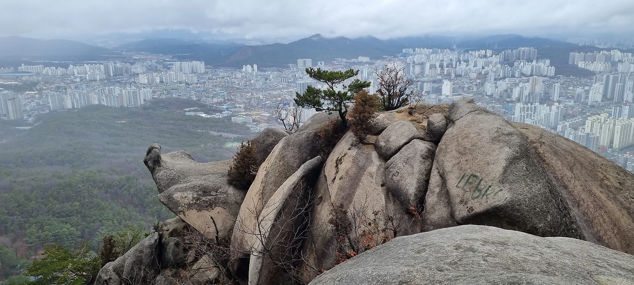 바로 아래에 있는 보루를 보고 위의 전망대도 보고 바로 아래에 있는 보루로 간다. 보루로 내려가는 길이 보루 위에서 바로 내려갈 수도 있는데 우리는 배낭을 두고 올라왔기에 내려가서 배낭을 가지고 바로 아래의 보루로 간다. 보루로 가는 길이 암릉을 아슬아슬하게 내려가는 길에 있어서 이길로 가지 말라고 하였는 것 같다. 하지만, 손을 잡고 발을 디딜 수 있는 곳이 있다. 등산로를 다시 만났다. 아래의 보루를 보기 위하여 올라간다. 사람들이 그렇게 많이 다녀서 그런지 바위에 홈이 파여 있다. 이곳에서 멀리 안골 능선 내려가는 방향의 능선에 있는 남근석을 확인해 본다. 친구가 콘도르 바위라고 하는 곳에 가보았다. 콘도르처럼 머리가 있다. 이곳에서 아래로 내려다 보이는 의정부를 담아 본다. 콘도르바위에 너도나도 사진을 찍기위하여 올라간 흔적이 역력하다.