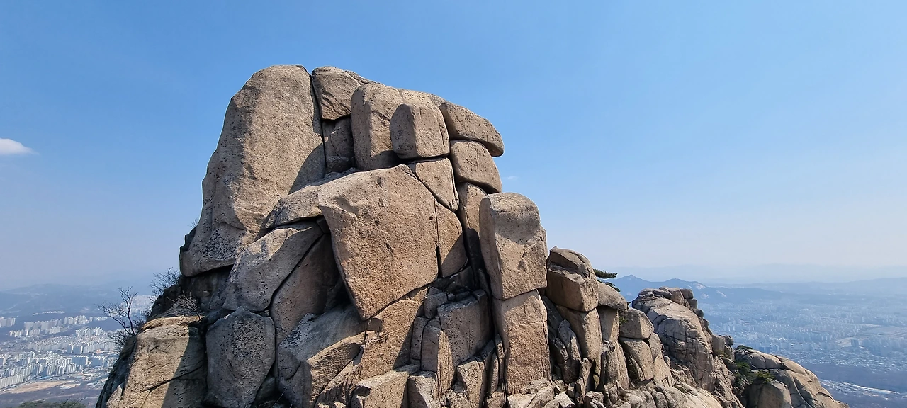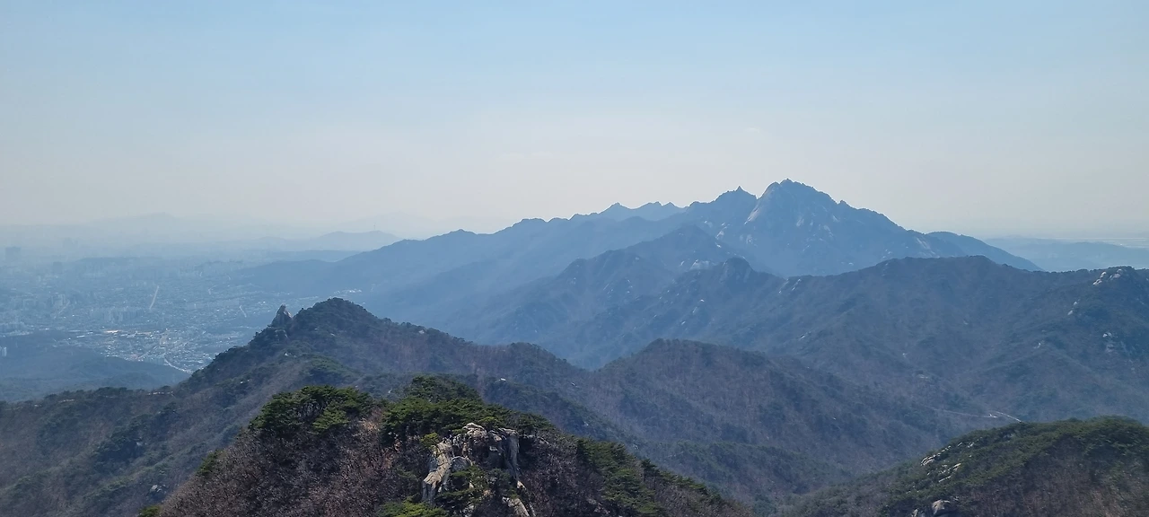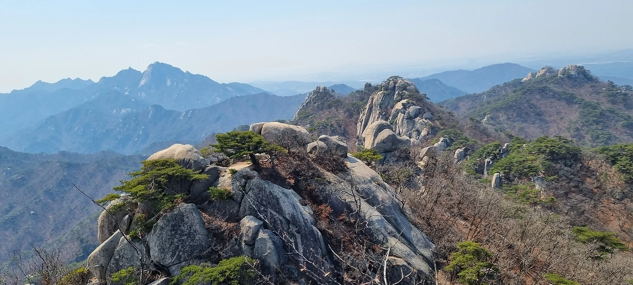 원도봉까지 몇 번의 암릉을 밧줄을 잡고 오른다. 데크를 오른다. 우리에 앞서 있던 어르신들이 데크를 앞에 두고 장소가 좋은 곳에 앉아서 쉬고 계신다. 한숨 돌려서 올라가기 위하여 쉬엄쉬엄 가는 것 같다. 원도봉을 올라서서 멀리 포대능선을 바라다본다. 지난주는 아무것도 볼 수 없었는데 오늘도 미세먼지가 있어서 그렇지 경치를 그대로 볼 수 있어서 좋다고 만 할 수 있다.