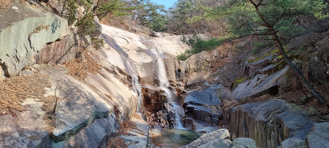 오봉을 가기 전 마지막으로 전망바위다. 멀리 북한산도 보이고 오봉도 보이며, 우이암도 보인다. 이제 힘든 구간을 끝이다. 내려가면서 볼거리는 송추 폭포밖에 없다. 계곡에서 능선에 접근할 때 가파르고 그전까지는 평탄한 구간이다. 하산 코스도 마찬가지다. 폭포가 있다. 송추 폭포다. 봄이지만 물이 적절하게 있어서 폭포의 맛을 그대로 볼 수 있어서 좋았다. 사람들이 없다. 이리로 내려오는 사람이 거의 없다. 대부분의 사람들이 오봉가 여성봉으로 방향을 잡기에 그렇다고 보아야 할 것이다. 예전에 많이 가본 오봉, 여성봉 코스로 회피하고 송추 폭포 코스로 내려가는 것이다. '송추'는 소나무[松]와 가래나무[楸]가 많아 붙여진 이름이라고 한다.