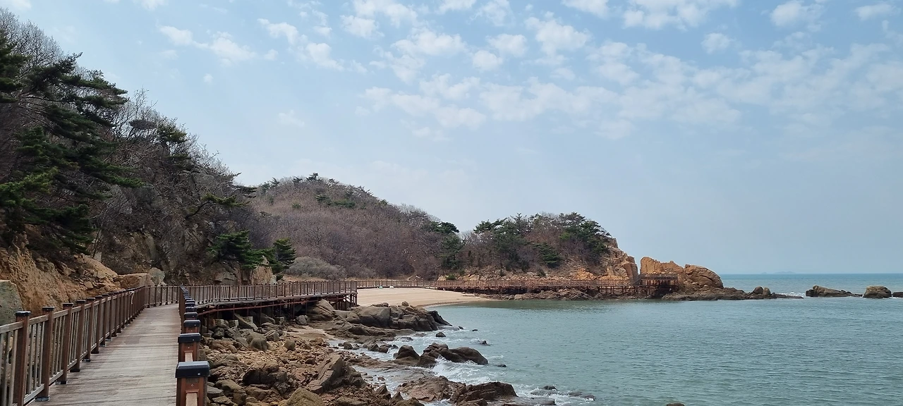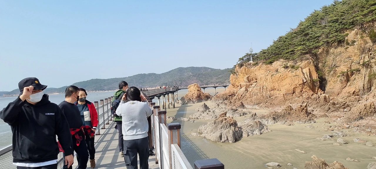 소무의도를 위에서 내려다 보고 호룡곡산 정상에 도착하였다. 둘레길 1코스와 2코스에서는 사람들을 거의 보지 못하였는데 국사봉과 호룡곡산 정상에서 사람들을 보았다. 이제 환상의 해변으로 내려간다. 내려가면서 부처바위가 있는데 아무리 보아도 잘 모르겠다. 아름다운 해변으로 가는 이정표가 있는 곳에서 왼쪽으로 내려간다. 계곡을 따라 내려간다. 해상관광탐방로를 접한다. 해안선을 끼고 데크를 만들어 놓았다. 1코스와 2코스에서는 사람들이 없었는데 이곳은 너무 많다. 탐방로 아래에는 물이 없고 모래펄만 있다. 시간이 맞지 않아서 물과 해안절벽의 조화를 볼 수없었다. 해상관광탐방로로 내려오기 전에 오른쪽으로 난 등산로를 따라가면 그것인 환상의 해변로다. 이제는 데크로 된 해상관광탐방로가 있어 그렇지 못하지만 예전에는 이곳에 들르면 저 환상의 해변로를 걷지 않는다면 무의미하다고 하였다. 하나개 해수욕장에 도착하여 오! 수정, 천국의 계단 촬영 세트장을 본다. 이제는 오래되어 그 역사를 보기에는 어려움이 있다. 세트장도 이제는 문을 닫아 두어 그 운치를 확인할 수도 없다. 고운 모래가 있는 하나개 해수욕장에서 짚라인을 타면서 봄날을 즐기는 사람들을 바랄 뽈뿐이다.