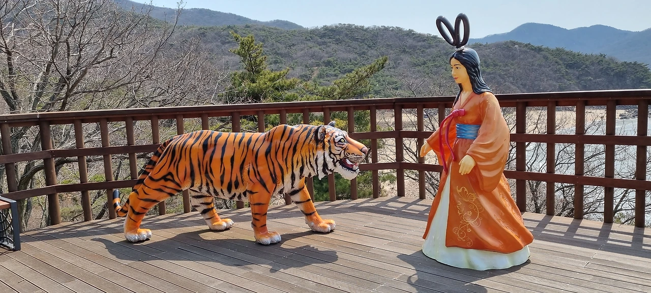 2코스도 해안 데크, 산길도 지나면서 바닷가를 계속 즐긴다. 2코스 중간에 호랑이와 셋째 공주도 있고 끝나는 지점에 꽃게상이 있다. 꽃게상이 있는 지점에서 이제는 국사봉으로 간다. 봉우리재까지 시멘트 포장길이다. 봉우리재에서 능선을 만나고 큰 무리선착장과 국사봉 갈리길이다.
