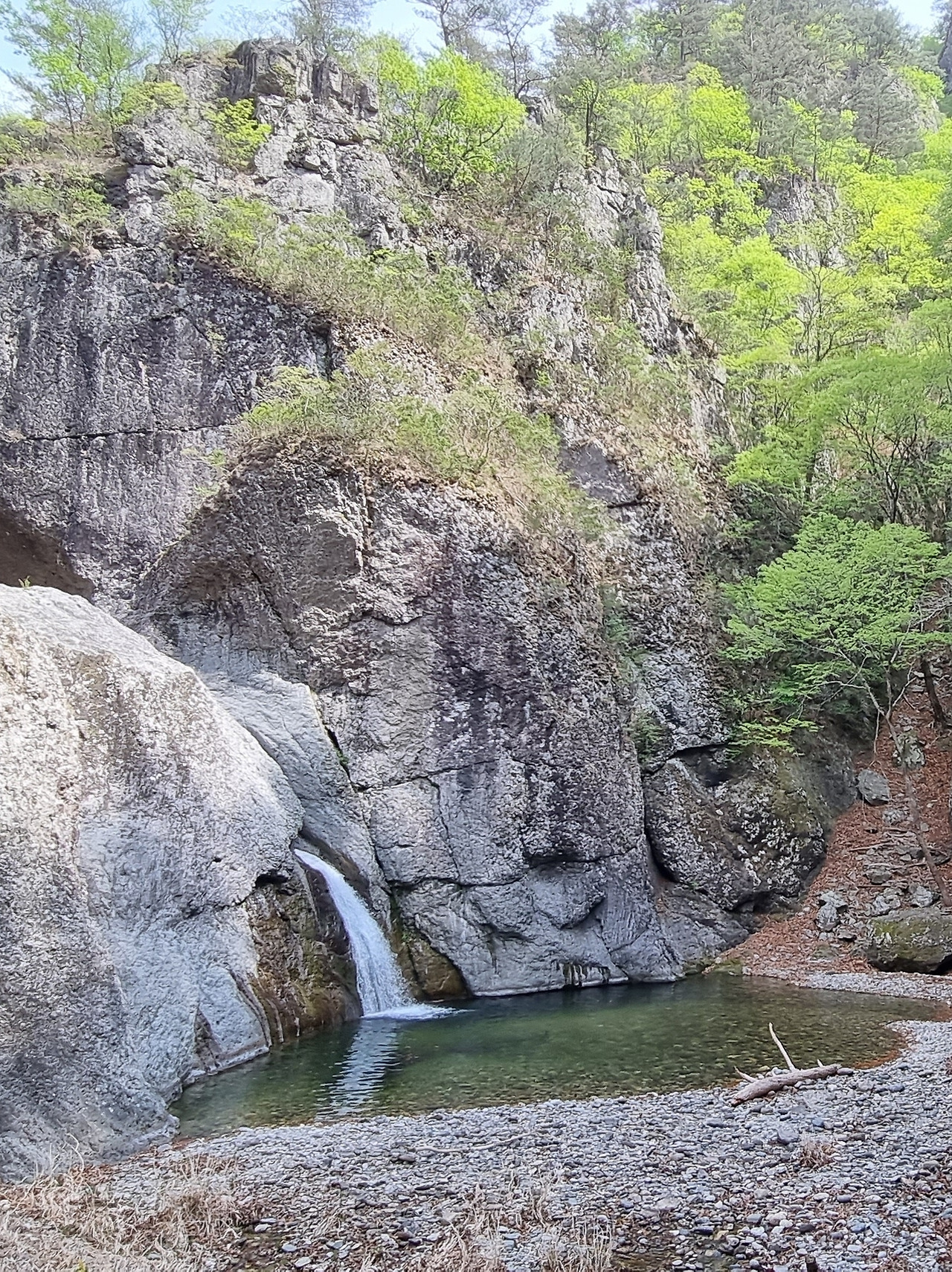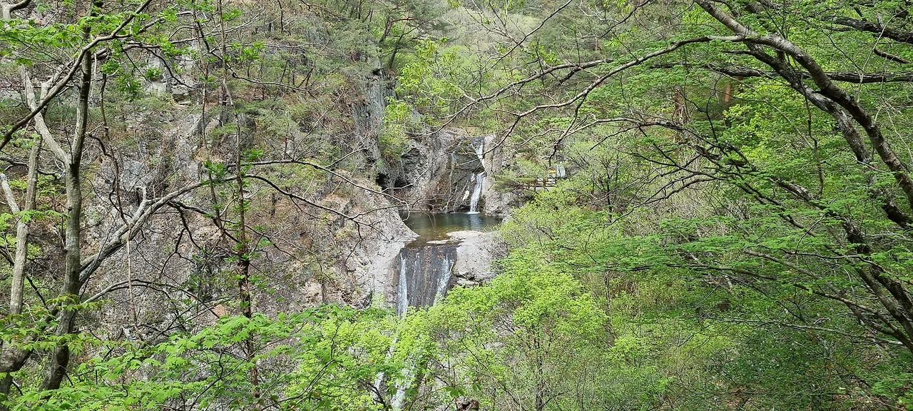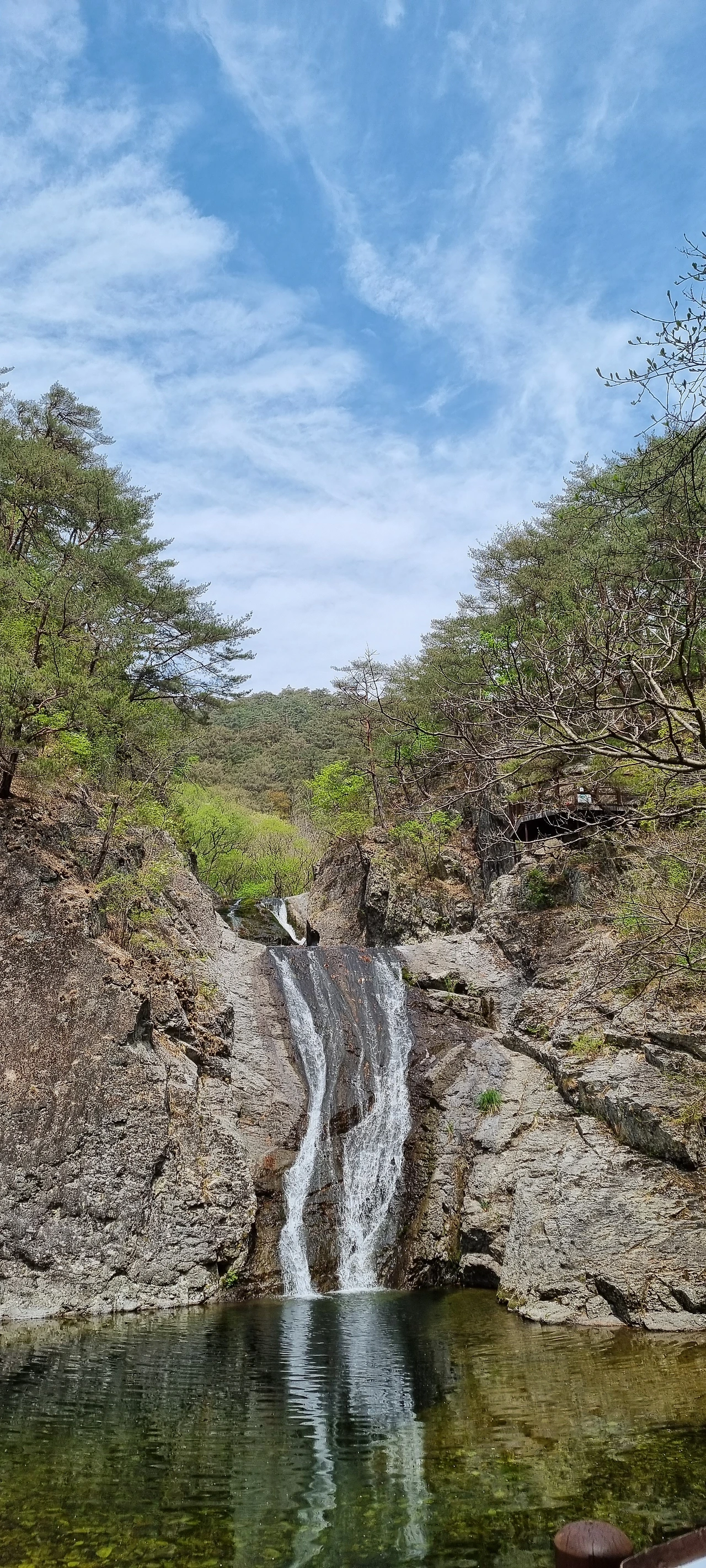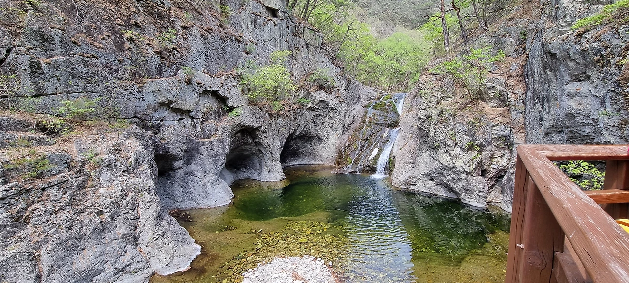 용추협곡에 가는 길은 평탄하다. 예전에 이곳에 마을이 형성되어 있었으나 이제는 이주를 하였다고 한다. 용추(龍湫)는 ‘용이 폭포에 살다가 하늘로 승천한 웅덩이’란 뜻이다. 용추협곡은 곡벽 경사가 거의 수직을 이루고 곡벽 높이가 거의 100m 이상이다. 바닥 폭이 학소대에서 대전사 일대까지는 10~20m이지만, 용추폭포 일대에서는 3~5m 내외로 급격히 좁아진다. 그러나 횡단면은 여전히 거의 수직에 가까운 V자형을 보인다. 용추협곡에는 용추폭포가 형성되어 있다. 용추폭포는 총 3단으로, 1단 폭포와 2단 폭포는 낙수 폭이 2m, 낙차가 1~2m로 소규모이지만, 폭포 아래에는 유수의 흐름에 의한 마식작용으로 포트홀(pothole)이 각각 폭 3m, 깊이 2m 그리고 폭 8m, 길이 5m, 깊이 1m 정도로 발달되어 있다. 하부의 3단 폭포는 용추폭포의 주 폭포로, 폭 2m, 낙차 5m 규모로 나타나며, 아래에 큰 규모의 폭호를 형성하고 있다. 용추협곡에서 바라다보는 학소대가 어떻게 보면 더 멋있다. 용추폭포를 배경으로 사진을 담는 장소에 우리도 사진을 담는다.
