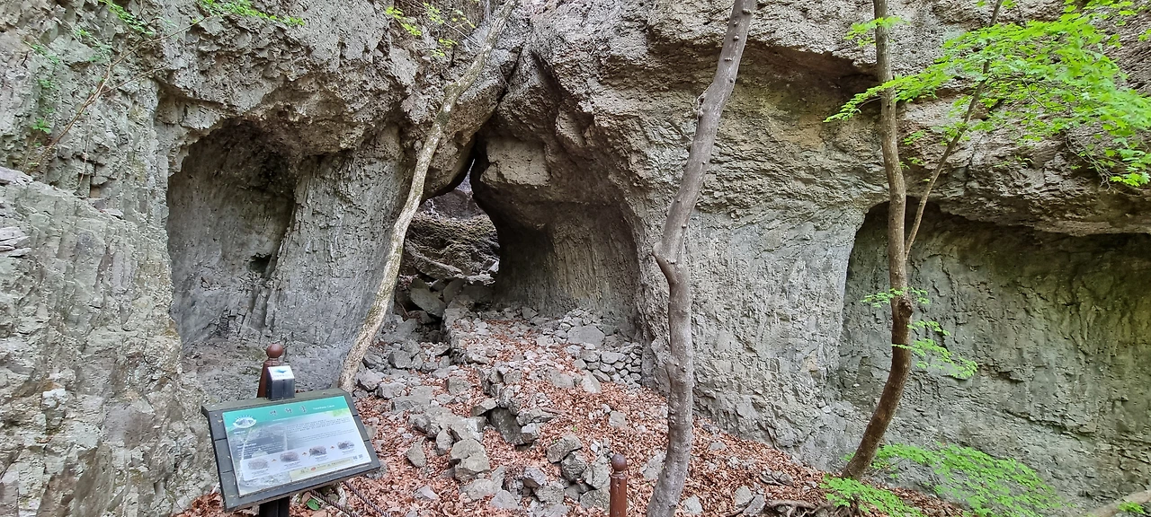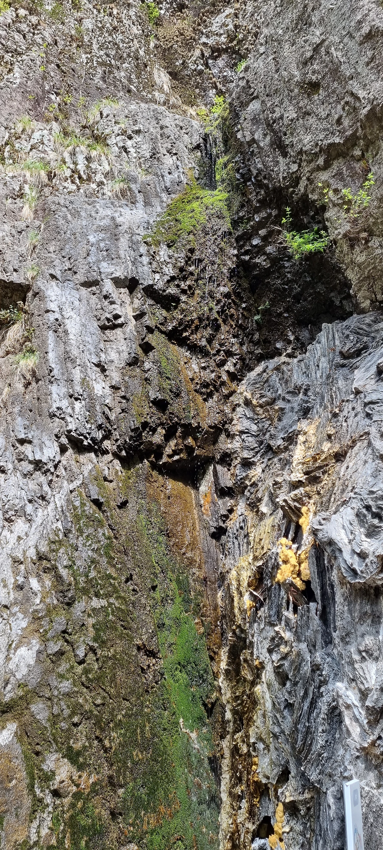 마지막으로 연화굴로 간단. 저번에 왔을 때에는 연화굴을 가보지 않고 내려갔는데 오늘은 가볼 것이다. 주왕산의 지형을 설명하면서 연화굴을 설명한 것을 보았다. 주왕굴에서 내려가서 대전사로 내려가는 탐방로를 만나고 용추협곡으로 100m쯤 올라가면 연화굴로 가는 길이 나온다. 올라가다 보면 하천 건너를 본다. 급수대와 신선대를 다시 본다. 주왕굴이 있는 경치를 그대로 볼 수 있다. 이제 연화굴로 가는 이정표가 나온다. 200m라고 표시되어 있다. 올라가는 길이 가파르다. 대부분의 사람들이 거의 올라가지 않는다. 연화굴은 다른 굴하고 특이한 모양을 하고 있다. 주왕산의 응회암의 특징을 그대로 보여주고 있다. "주왕산은 7000만 년 전 백악기 공룡시대 화산이 10차례 정도 폭발하면서 생긴 기암절벽으로 유명하며, 비경도 좋지만 수천만 년 영험한 기운이 감도는 숨은 동굴이 있다. 연화봉의 연화굴은 지질 전문가들도 잘 모르던 곳"이라는 안내를 본 기억이 있다. 이것에 대한 설명을 보면 여러번의 화산 분출로 다양한 형태의 절리가 형성이 되었으며, 가운데에 있던 수직절리가 다른 절리보다 빠르게 침식되었으며 그 침식된 틈을 이용하여 물이 흘러 통로형 동굴이 형성되었다고 한다.