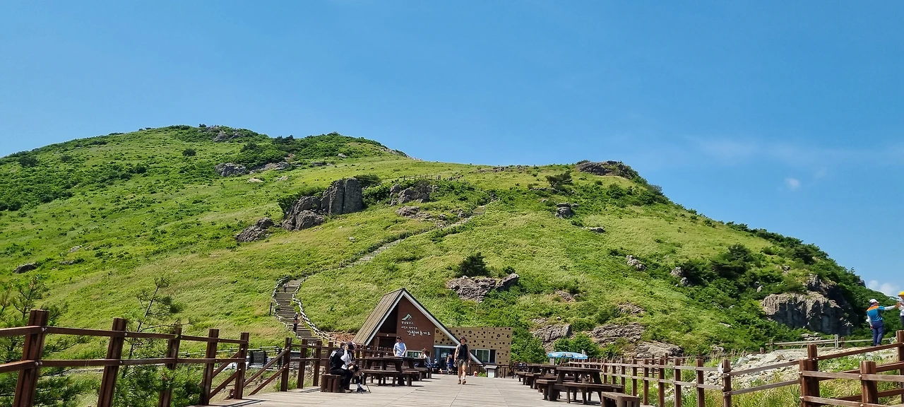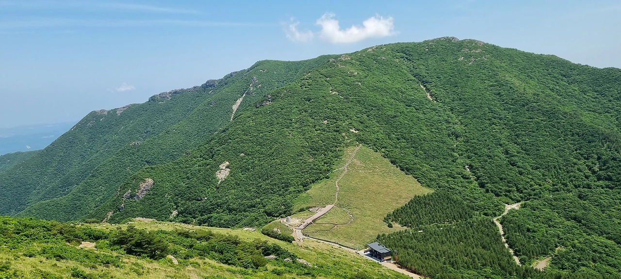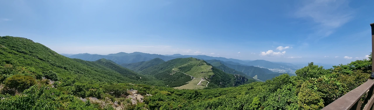 간월산에 도착하여 인증을 남긴다. 앞에 있는 사람들도 인증을 남긴다. 작년까지는 정상석에 몇 년이라고 표시하여 두었는데 그것은 없어지고 정상에서 사진을 바로 전송하여 인증을 받는 시스템으로 영남알프스 인증시스템이 변경되었다고 한다. 나는 영남알프스 이능은 관심이 없고 나만의 인증을 남긴다. 산을 돌아가기 전 그늘을 만들어주고 있는 소나무 아래에서 늦은 점심을 해결한다. 늦은 점심이라 그런지 이렇게 좋은 장소가 나를 위하여 비워져 있다. 약간 늦은 점심을 먹는 것은 중간중간에 간식으로 해결한다. 2시간 이상 걸으면서 피곤해진 내 다리에게도 휴식이 필요한 것이다. 전망대가 있다. 전망대에서 아래를 내려다본다. 초원이 있고 산장이 있고 휴게소가 있다. 그리고 산길과 임도가 있다. 아무것도 없는 것이 좋다는 사람도 있지만 초원이 있으면 그 초원만이 좋은 것이 아니고 초원과 어울리는 아름다운 산장이 있으면 더욱 좋다. 나는 그것이 좋다. 아래로 내려다보면서 가까이 다가와 있는 신불산도 담아본다.
