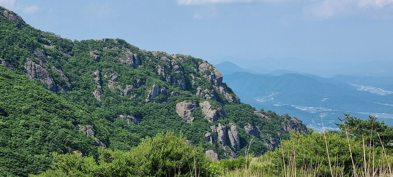 좌측에 있는 재약산, 천황산 등이 있지만 산을 오르는 배내골은 아래에서부터 오르니 이곳의 정산에 평전들이 있다는 사실을 믿기가 어렵다. 그래도 배내봉에 도착하여 주섬주섬 모두들 버스 밑에서 배낭을 챙기고 화장실에 줄을 길게 서서 산행을 준비한다. 화장실은 간월재에 있다고 하는데 거기까지 2시간 이상 소요되니 우선 급한 것은 해결해야 한다. 산을 다니면서 노천 화장실을 많이 사용하지만 화장실이 있는 곳은 최대한 이용을 하는 것이 남들 보기에도 좋다. 배내봉을 오르면서 친구가 왜 이곳에서 힘들어했는지 이해를 한다. 처음부터 계단의 연속이다. 오두산을 가는 길이 있지만 우리는 배내봉이다. 배내봉까지 2km도 안되는데 여름날 뜨거운 햇빛이 나무터널을 벗어날 때마다 얼굴을 때린다. 해발이 800m 이상 오르면 시원한 바람이 불겠지만 아직은 아니다. 배내봉 정상에 올라 시원한 바람을 맞이하지만 작렬하는 태양이 발걸음을 재촉한다. 뒤를 돌아서서 보면 멀리 가지산, 운문산, 고현산이 보이고 좌측으로 재약산과 천황산이 보인다.