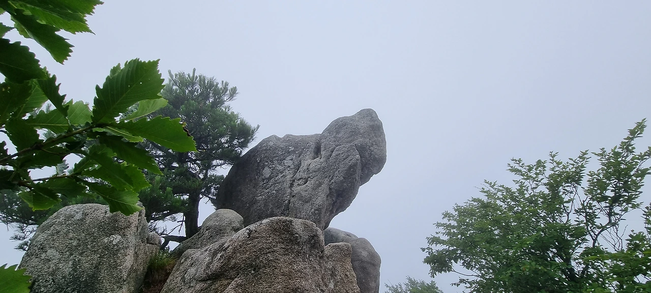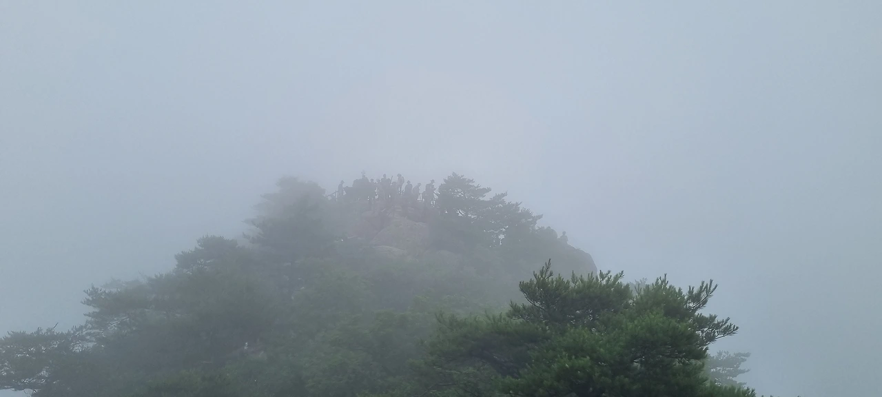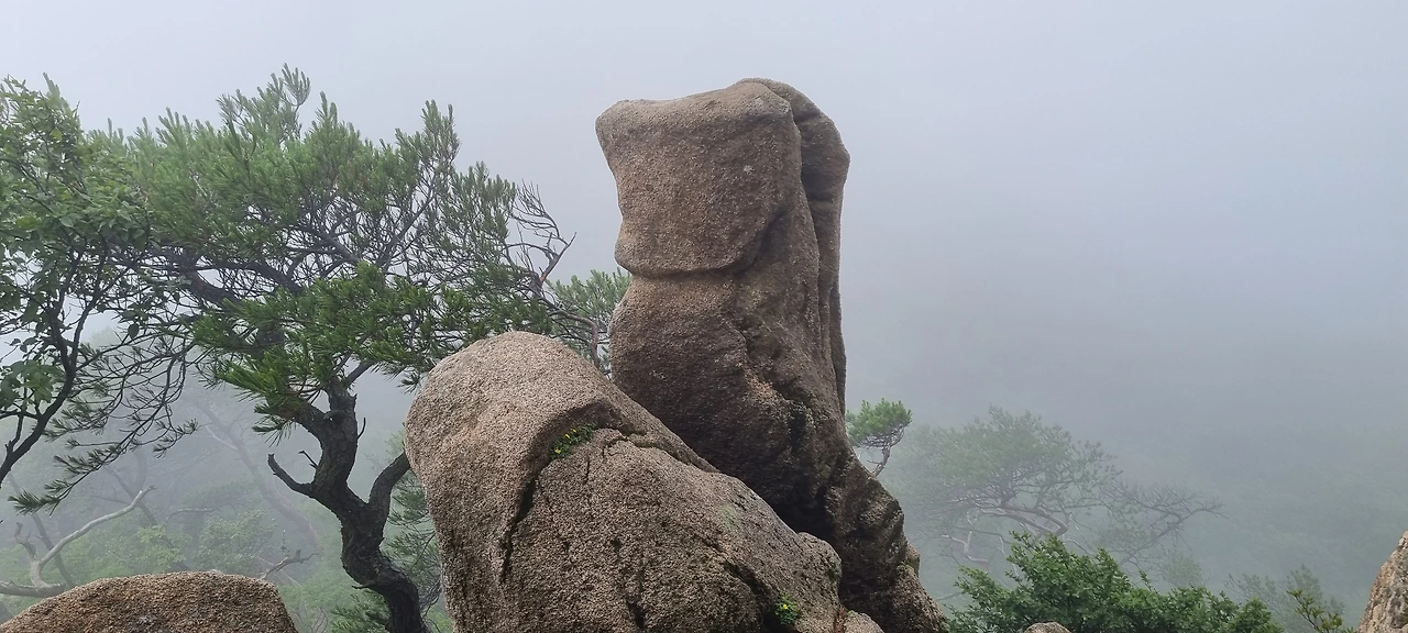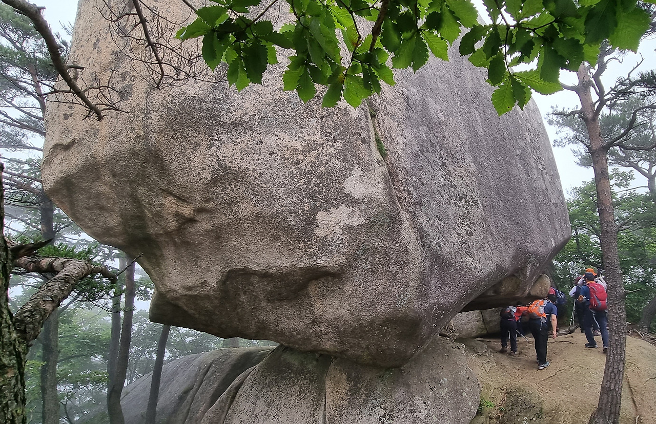 정상을 하산하여 밀재로 간다. 정상을 내려가서 갈림길에서 우측으로 가야 하다. 정상을 내려가는 길이 일방통행이다. 올라오는 사람이 계속이다. 잠시만 멈추어달라고 하여 내려간다. 끊임없이 오르는 행렬을 멈추고 내려간다. 갈림길에서 밀재를 가는 봉우리를 올라서 정상을 바라보니 안갯속에 선계를 이루고 있다. 안갯속의 소나무가 있고 바로 옆에 있는 선바위가 있고 그 아래는 낭떠러지다.