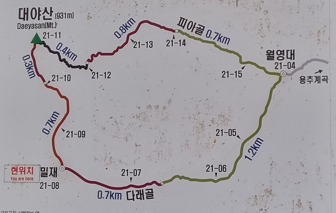 버스를 이동하면서 산악대장은 대야산을 오르는 등산로를 안내한다. 산악회에서 인터넷에서 주차장을 출발하여 용추폭포를 지나고 월영대 삼거리에서 밀재를 거쳐 대야산 정상으로 가는 길로 안내되어 있는데 산악대장은 그렇게 가는 것은 잘못되었다고 하면서 삼거리에서 오른쪽으로 바로 대야산 정상으로 가는 것이 좋다고 한다. 산을 오를 때 가파른 곳으로 오르고 완만한 곳으로 하산하는 것이 좋다는 것이다. 밀재로 가면 밀재에서부터 정상까지 조망터가 있지만 정상에서 월영대까지 내려오는 길이 너무 가파르다는 것이다.