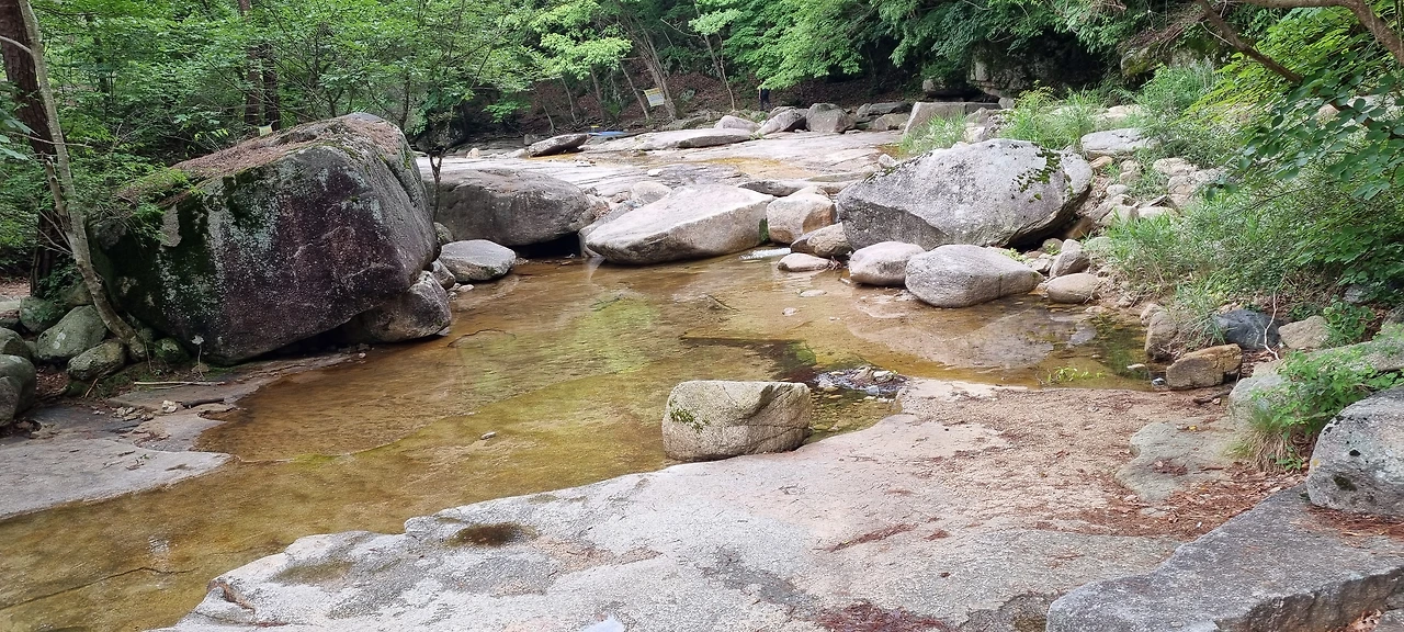 월영대에서 이분들하고 헤어졌다. 월영대에서 한 번쯤 쉬고 그 경치를 즐긴다. 그리고 내려가면서 계곡에 앉아 대야산을 즐긴 땀을 흘러 보내고 내 발도 물속에 담그고 1시간을 흘러 보낸다. 지나가는 사람들이 내 주변을 채웠다가 비웠다가 한다. 구름 속에 태양이 살짝 얼굴을 비추기도 하지만 계곡에서 발을 담그고 나만의 고독을 즐긴다. 버스가 약속한 시간을 1시간을 남겨두고 주차장으로 서서히 이동을 하는데 피서객들이 계곡을 이곳저곳 자리를 잡고 쉬고 있다. 물속에 의자를 두고 그곳에서 졸고 있는 사람이 재미있다. 그러다가 물속으로 들어갈 수도 있겠다. 편안하게 잠들어 있다. 바위로 된 미끄럼틀에서 튜뷰를 타는 아빠와 아이들이 즐겁다. 용추를 지나고 용추계곡 입구에 있는 음식점에서 단체 산행객들이 모여서 먹고 즐기고 있다.