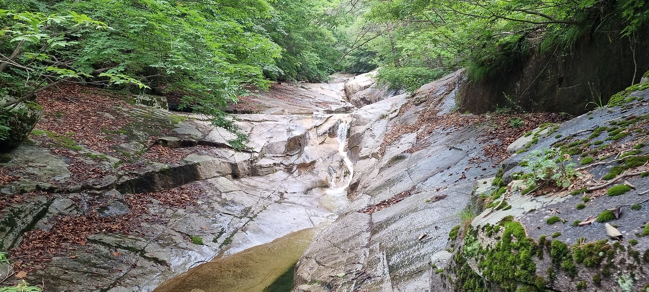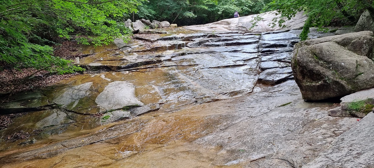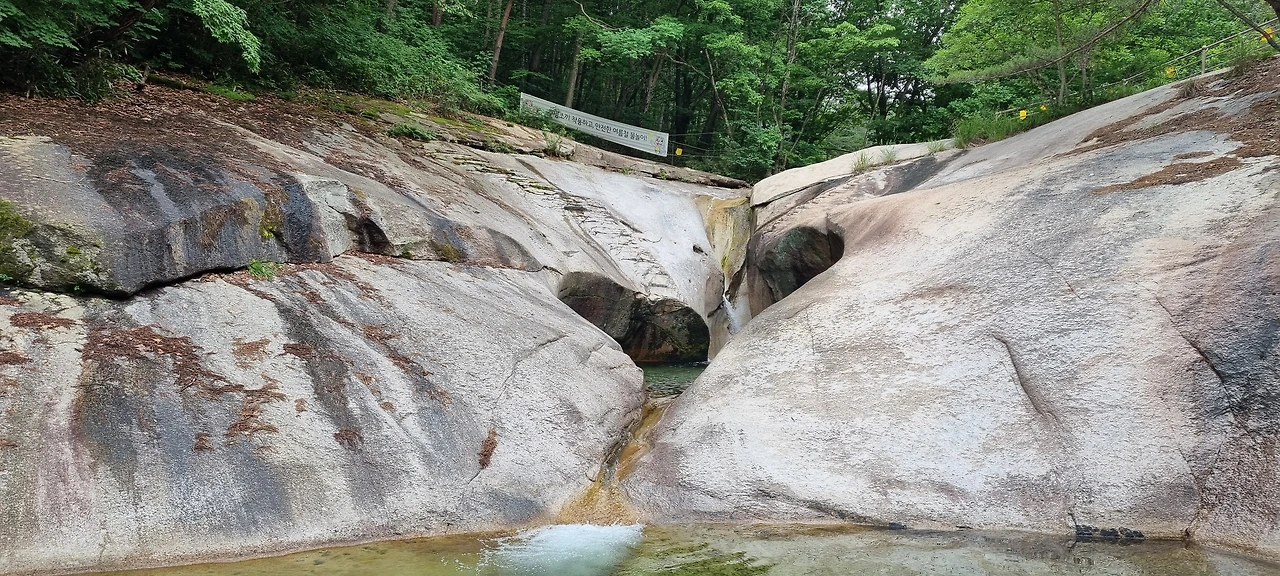 윗 용추에서 잠시 머물던 물이 다시금 매끈한 암반을 미끄럼 타듯 흘러내려 부드럽게 이루어 놓은 것이 아래 용추로 하절기에는 개구쟁이 꼬마들의 미끄럼틀로 이용되기도 하는 곳이다.