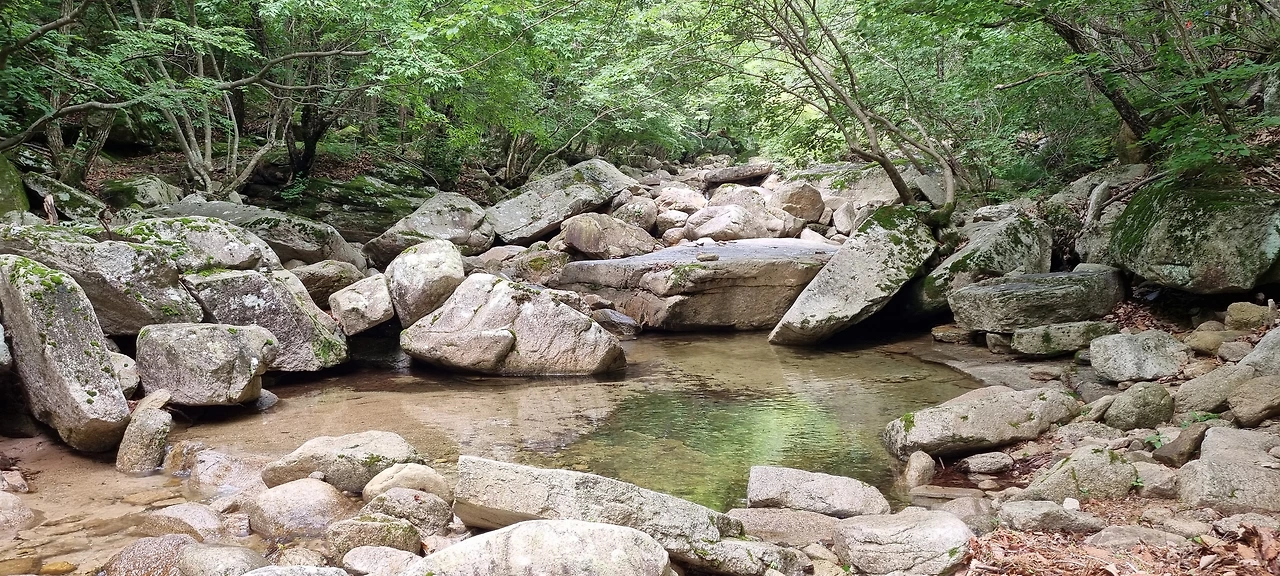 버스는 주차장에 도착하고 바로 전에 도착한 다른 산악회 사람들은 모두가 알고 있는지 단체로 준비운동을 하고 있다. 산을 오르기 전 몸을 풀고 있다. 우리도 내려서 몇 명이 내려서 그것을 따라 하는 사람이 있지만 배낭을 챙기고 스틱을 꺼내고 등산모자를 쓰고 산으로 간다. 대야산의 주차장은 용추계곡을 가는 입구에 설치되어 있어서 용추계곡 전에 있는 산을 넘는다. 내 친구가 전에 무의도에 갔을 때 소무의도 주차장을 쉽게 갈 수 있도록 등산로를 만들어야 한다고 한 얘기가 생각이 난다. 대야산은 용추계곡이 먼저 형성이 되어 있었던 곳에 등산로를 개방한 것이며 대야산 주차장은 그 아래에서 설치되어 있는 것이다. 용추계곡 입구로 들어가기 전에 보면 하천 주변으로 계속적으로 사람들이 즐길 수 있는 곳이 나타난다.