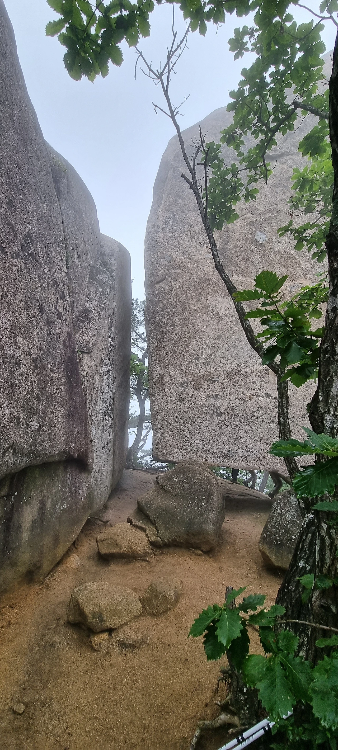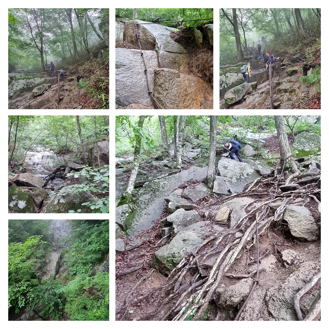 계곡을 오르면서 지금까지 오르면서 흐른 땀을 흐르는 물에 흘러 보낸다. 이제 계곡이 끝이 난다. 바로 앞에 절벽이 보인다. 이제는 가파름의 시작이다. 가파른 길에 등산로는 아침에 내린 비로 미끄럽다. 조심조심 움직인다. 데크가 중간중간 있지만 어려움은 계속이다. 어떤 곳은 나무뿌리 근처의 흙들이 없어져 그물을 바닥에 펼쳐 놓은 것 같다. 그 그물 사이를 조심스럽게 지나간다. 또 바로 옆에 숨겨진 조그마한 폭포에서 물이 흘러내리고 있다. 비가 조금 더 많이 내렸으면 장관을 이루었을 것이다. 조심스럽게 지나가는 등산객이 있다. 내려오는 등산객이 있다. 그분이 존경스럽다. 이렇게 험악한 곳을 내려온다는 것이 존경스럽다. 나는 이렇게 못 내려올 것 같다.