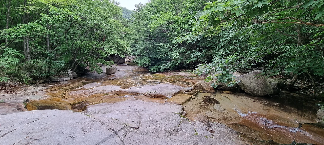 용추폭포 위의 넓디넓은 암반지대를 지나 20분쯤 올라가면 월영대(月影臺)라는 또 다른 명소가 기다리고 있으니 휘영청 밝은 달이 중천(中天)에 높이 뜨는 밤이면 희디흰 바위와 계곡을 흐르는 맑디맑은 물 위에 어린 달그림자가 더할 나위 없이 낭만적이라 하여 월영 대라 했던가?"(출처 : 문경시청 홈페이지) 용추와 월영대가 가장 유명하지만 곳곳에 대가 있다. 용추를 지나면서 대와 담을 담아 본다. 계곡 이곳저곳에 피서를 온 사람들이 아침부터 자리를 잡고 있다. 대야산을 하산할 때 저곳에 밤을 담그고 놀아보리라 생각을 하고 걷는다.