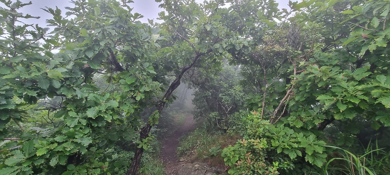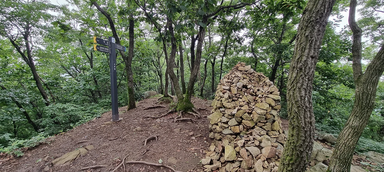 시루봉에 있는 시루봉 모양의 돌탑이 바람과 비에 의하여 무너져 있다. 봄에 왔을 때 깔끔하게 괜찮았는데 여름의 오서산에 오니 슬쩍 무너져 있다. 이정표에 590m라는 표지가 있고 시루봉이라는 표지가 있다. 이제는 정상까지 200m만 오르면 된다. 쉬엄쉬엄 오르면 된다. 이곳까지 오면서 전망은 아무것도 없다. 나무와 나무 사이에도 보이는 것이 없다. 그저 오를 뿐이다. 시루봉까지는 야생화도 없고 그냥 오르기만 한다. 큰 나무들 사이에 잡목도 없다.
