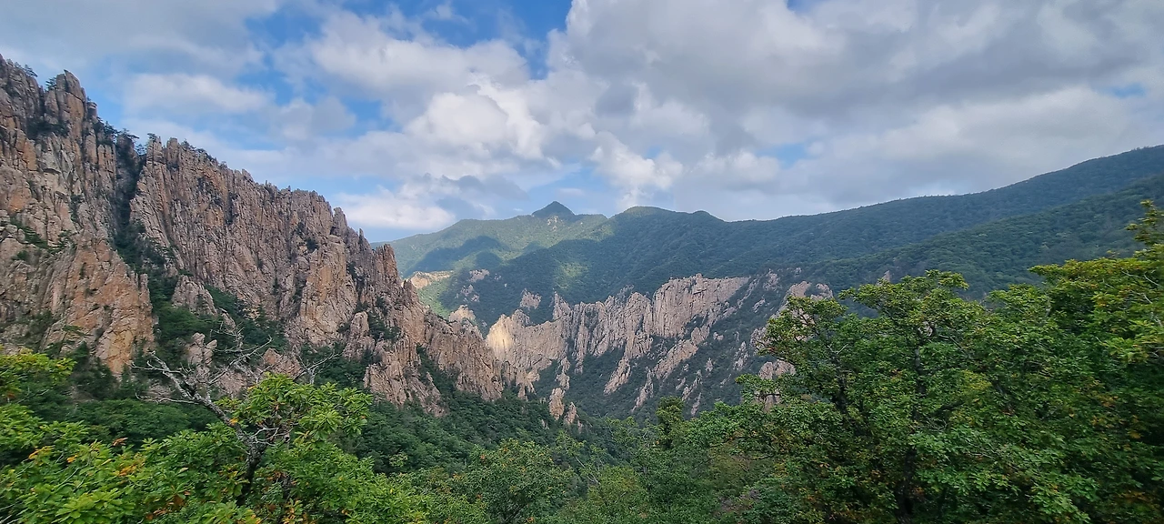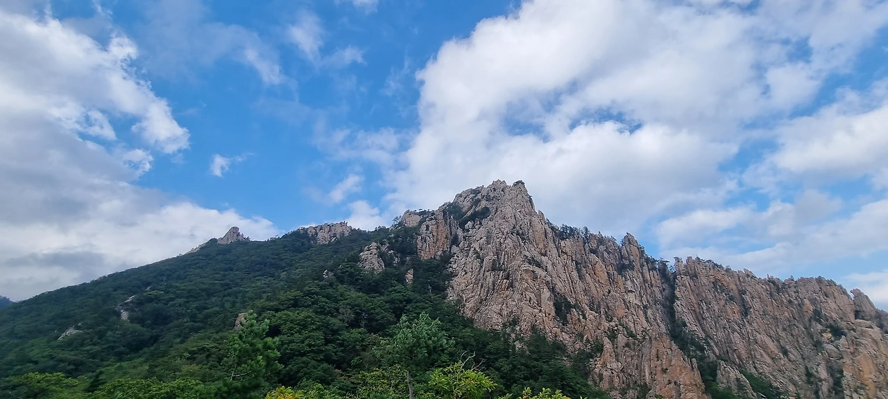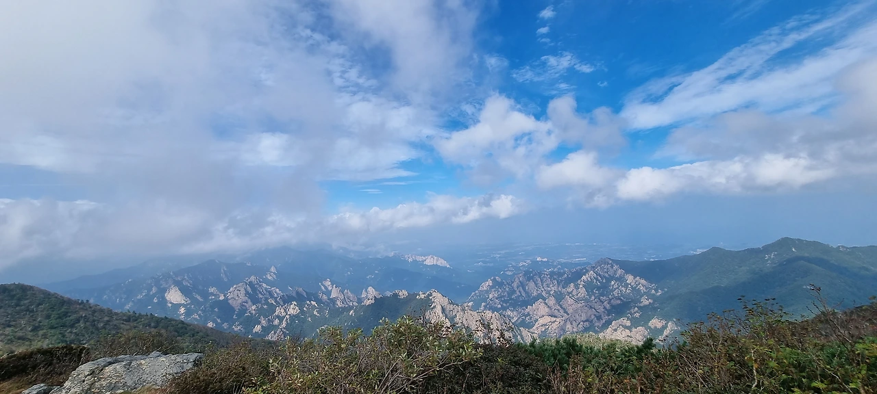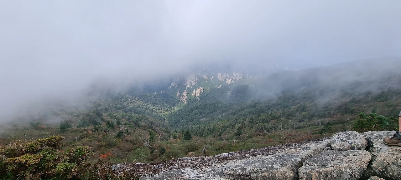 서북능선을 걸으면서 왼쪽은 용아장성, 오른쪽은 한계령에서 내려오는 길이다. 주전골, 흘림골 등도 있다. 하지만, 아무것도 볼 수 없다. 잠깐 왼쪽에서 용아장성을 보여주지만 그것은 눈으로만 나무 사이로 볼뿐이다. 아쉬움이 가득하다. 끝청에 도착했을 때 그래도 잘 보이기를 기도할 뿐이다. 1시간쯤 걸었는데 초등학생 2명이 앉아서 쉬고 있다. 엄마 아빠랑 가족이 한계령에서 출발하여 대청봉까지 가는 것이라고 한다. 천진난만하게 엄마 아빠를 따라온 것이다. 힘들지도 않은 것 같다. 엄마는 대견한지 연신 셧텨를 누르고 있다. 그 추억이 오래갈 것이다. 초등학교 시절의 추억이 참 멀리도 간다. 너덜지대를 지나는데 힘들다. 너덜과 너덜 사이에 숨겨진 비수를 잘 피하여 걷는다. 이 길이 그렇게 험악하지 않고 너덜 사이에 숨겨진 비수가 겁이 날 뿐이다. 그래도 대청봉을 가장 쉽게 갈 수 있는 꽃길이라는 등산객의 말에 모두들 수긍을 한다.