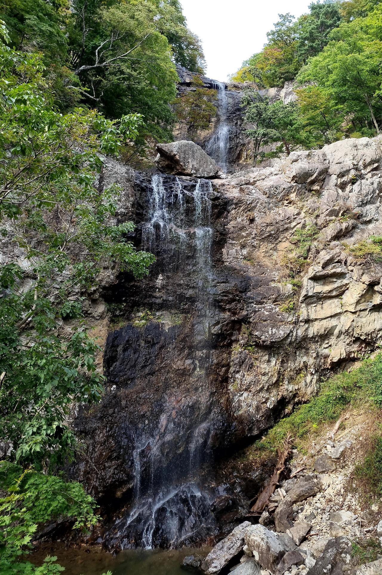내려간다. 흑룡 폭포도 본다. 친구 왈 그때는 보지 못하였다고 테크에 의하여 전망대가 만들어져서 이를 볼 수 있게 된 것이다. 흑룡폭포 전망대에 유리에 기대지 말라고 한다. 사람들이 사진을 좀더 잘 담기 위하여 전망대 끝에 다가서는 것이다. 그 전망대는 잔도위에 설치한 것이다. 그 잔도가 없었다면 흑룡폭포도 볼 수 없었을 것이다. 깍아지른 절벽사이에 난 폭포로 사람들이 접근하기 어려운 곳이다. 9월중순 쯤에 이곳에 가면 멋진풍광을 볼 수 있을 것이다. 여름에 내린비가 9월중순까지는 폭포에 영향을 줄 것이다.