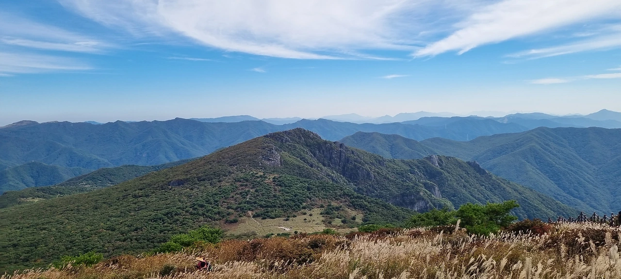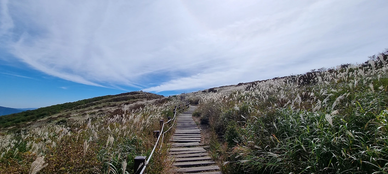 이제 재약산으로 간다. 천황재에서 뒤를 돌아보고 천황산과 천황재의 억새를 같이 담는다. 오래된 철도침목이 이제는 세월에 약이 없듯이 교체되고 있다. 오래된 침목이 세월에 의해 부식되고 이제는 새로운 목재로 교체되고 있다. 재약산을 오르면서 뒤를 돌아보면 천황산이 자리 잡고 있다. 재약산 정상석을 배경으로 인증샷을 남긴다. 정상석 뒤쪽으로 들어온 어느 여성분이 민폐를 끼치고 있다. 자기 자신만을 생각한다. 우리는 내려간다. 사자평을 바라다보고 내려간다. 내려가는 길이 너무 좋다. 데크에 충격 완화를 위한 고무판이 설치되어 있다. 타이어를 이용하여 만든 것이 아니라 별도의 고무판을 만들어서 설치하였다. 내려가면서 너무 힘든 내 무릎이 너무 좋다.