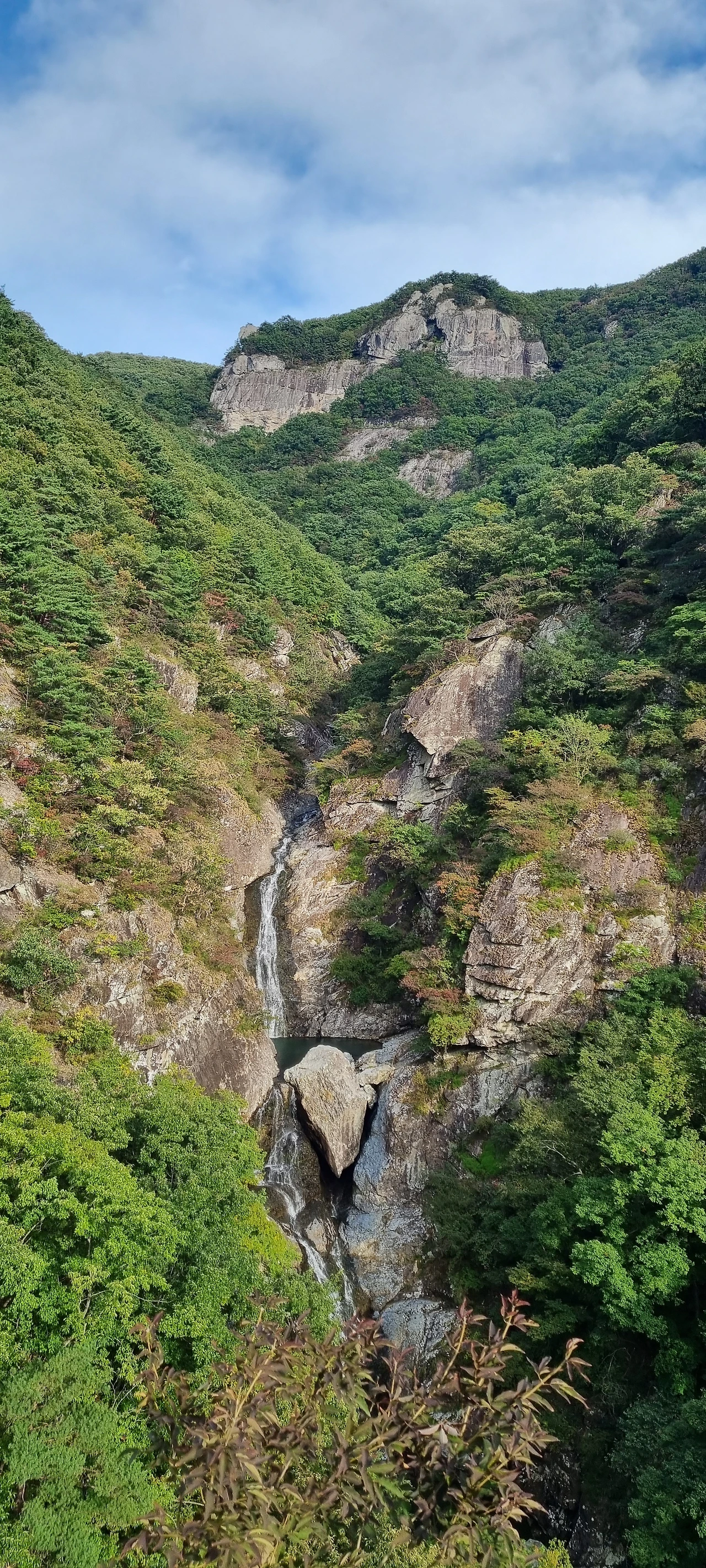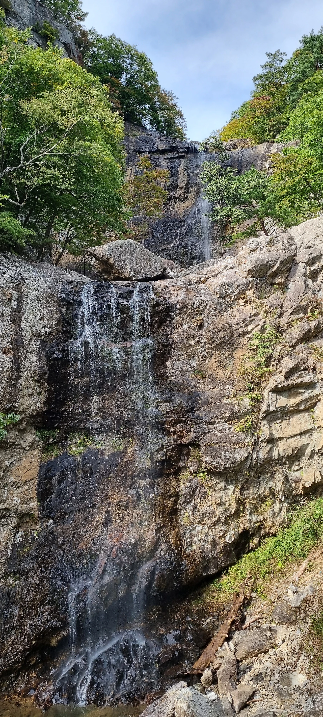 얼음골을 올라올때 같은 버스를 타고 온 등산객을 만났다. 우리에게 길을 물어본다. 그 길을 알려주면서 내려간다. 층층폭포를 알리는 이정표까지 내려가라고 안내를 한다. 작전도로를 따라 걸어가면서 너무 좋은 길을 만났다. 작전도로에 쇄석이 깔려있다. 층층폭포로 내려가는 계단을 내려가서 층층폭포를 그대로 느낀다. 친구는 3-4년 전에 이곳에 왔었는데 이러한 감흥을 느끼지 못하였다고 하였다. 그 이유는 데크로 결론을 내었다. 데크에서 1층 폭포와 2층 폭포를 동시에 볼 수 있게 된 것이 층층폭포의 감흥을 느끼제 만든 것이다. 하지만, 작년보다 물이 적다. 지난주에 왔으면 지금보다 물이 많아서 감흥이 더 컸을 것이다. 우리와 함께한 사람들 모두가 감흥을 느끼고 포토존에서 인증샷을 남긴다. 그리고 또 한번 자리를 잡는다. 2층 폭포와 1층 폭포사이에 난 계단에서 두개의 폭포를 동시에 잡아야 균형이 잡힌다고 보아야 할 것이다.