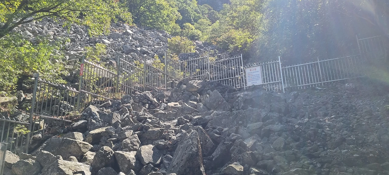 밀양 얼음골의 결빙지역을 지난다. 여름에도 돌 밑에 얼음이 있다고 한다. 오늘은 10월 초 그 얼음이 있을지 없을지 모르겠다. 다만, 이곳은 그러한 결빙지역이 있다는 것뿐 아무도 그곳을 관찰할 수가 없게 철망이 둘러쳐져 있다. 금수산의 얼음골에서 얼음을 직접 관찰할 수 있는데 이곳은 너무 많은 사람들이 와서 그렇게 철저히 봉쇄한 것이라고 본다. 아쉬움을 뒤로하고 오른다. 누가 그랬다고 한다. 설악의 오색이나 한계령에서 오르는 것 같다고 내가 생각해도 설악의 한계령에서 1시간쯤 오르는 것 같다고 보아야 할 것이다. 그곳에서도 1시간쯤 오르면 여유를 찾을 수 있는데 이곳도 유사하였다. 어쩌면 한계삼거리에서 귀때기청봉을 오르는 것 같기도 하였다.