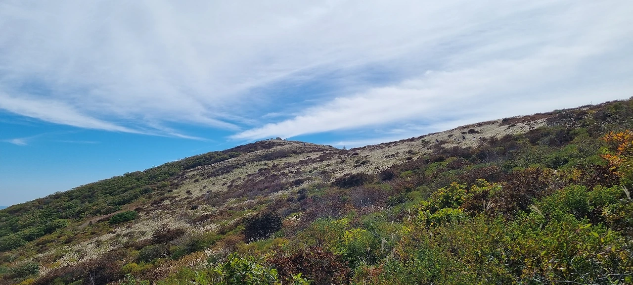 능선에 도착하고 다시 삼거리로 방향을 잡는다. 데크가 있다. 그 데크를 올라서는 것이 어떻게 보면 쉽다. 얼음골을 거스려 올라온 것이 오늘의 산행이다. 나머지는 재약산을 오르는 것 말고는 하산길이다. 삼거리에 도착하여 여유를 갖고 걷는다. 걸으면서 천황산 정상이 보인다. 억새가 피기 시작한다. 10월 둘째 주에서 셋째 주 정도 되면 억새가 만개할 것 같다. 그래도 피기 시작한 억새를 배경을 담아 본다.